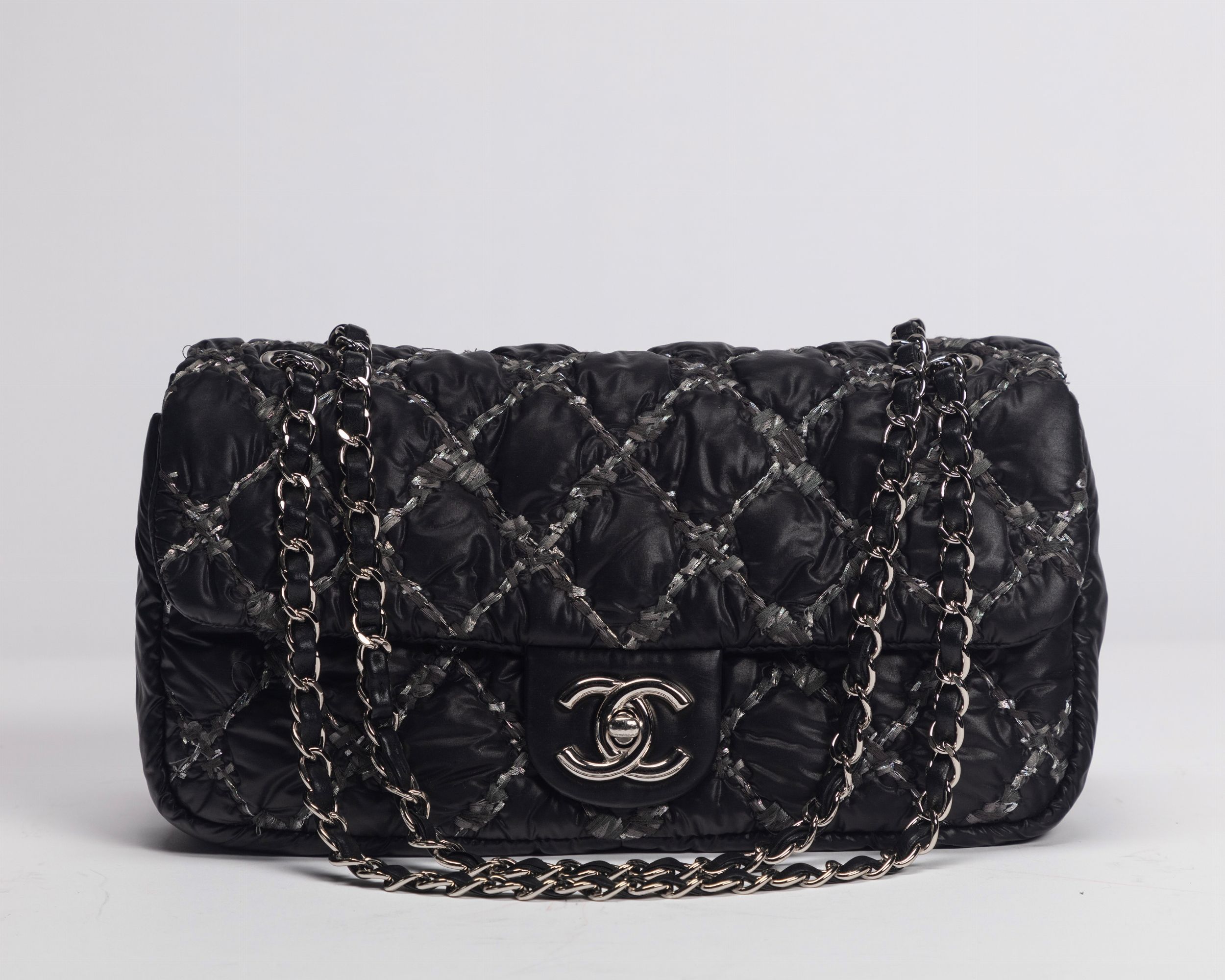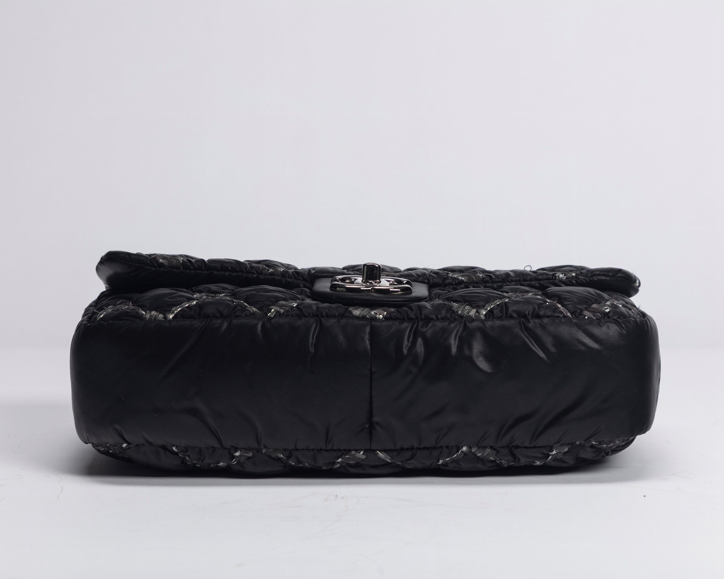 2010 in tessuto tecnico trapuntato color nero, dettagli in metallo e pelle, tracolla a catena, cm 27, con scatola