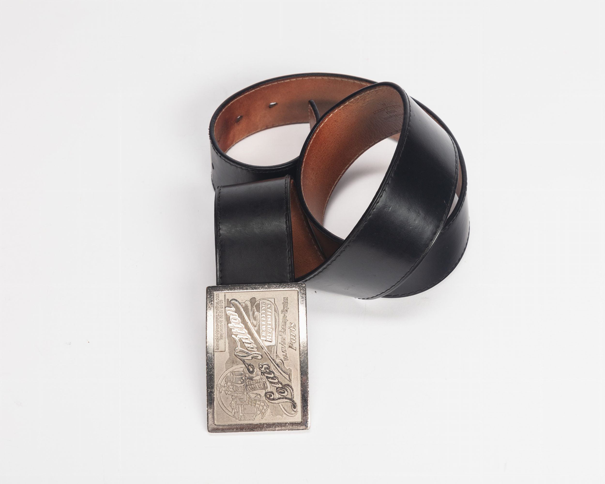 in pelle nera, con grande fibbia in metallo, cm 100 (difetti)