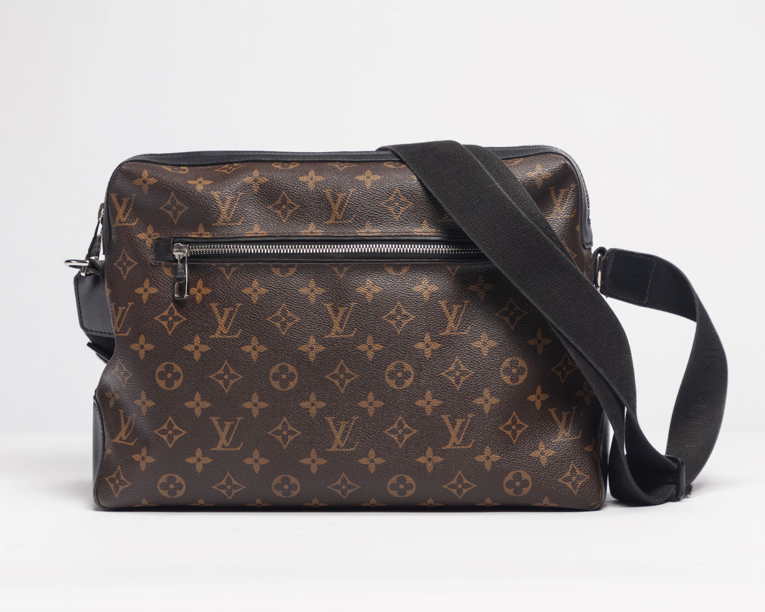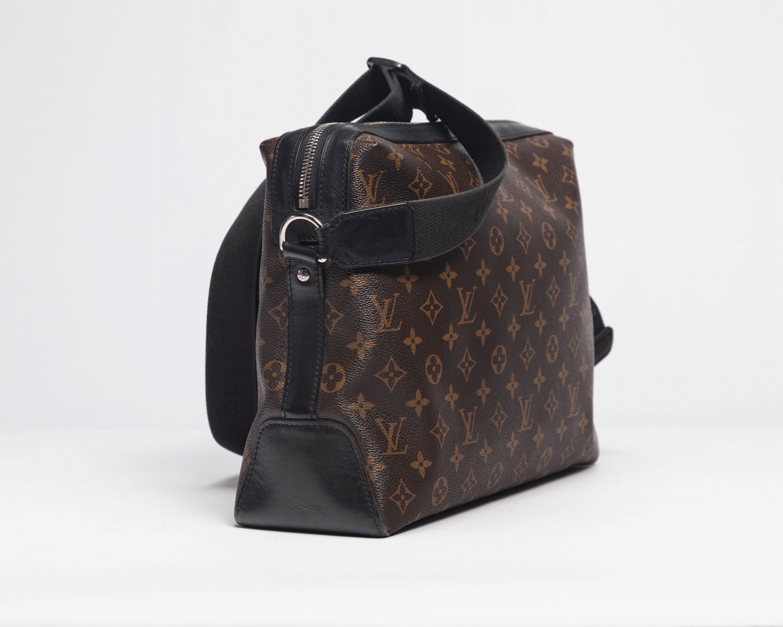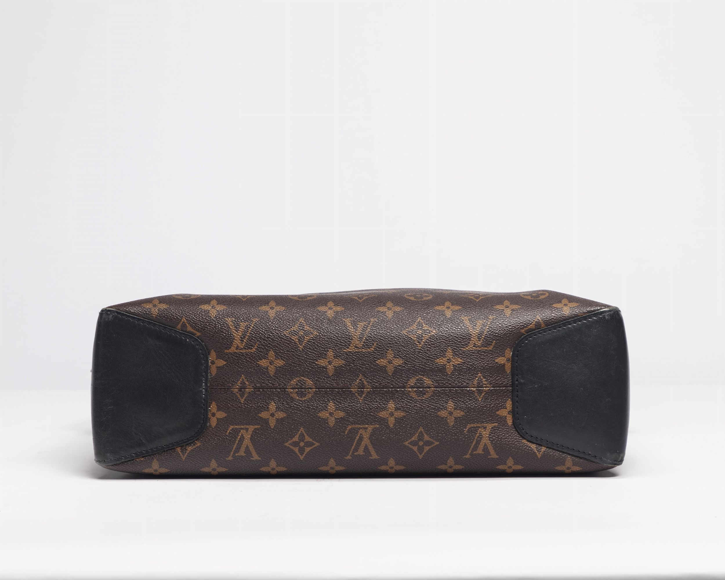 2014 in tela monogram, chiusura a cerniera, profili in pelle nera, tracolla in tessuto regolabile, cm 35 (lievi difetti)