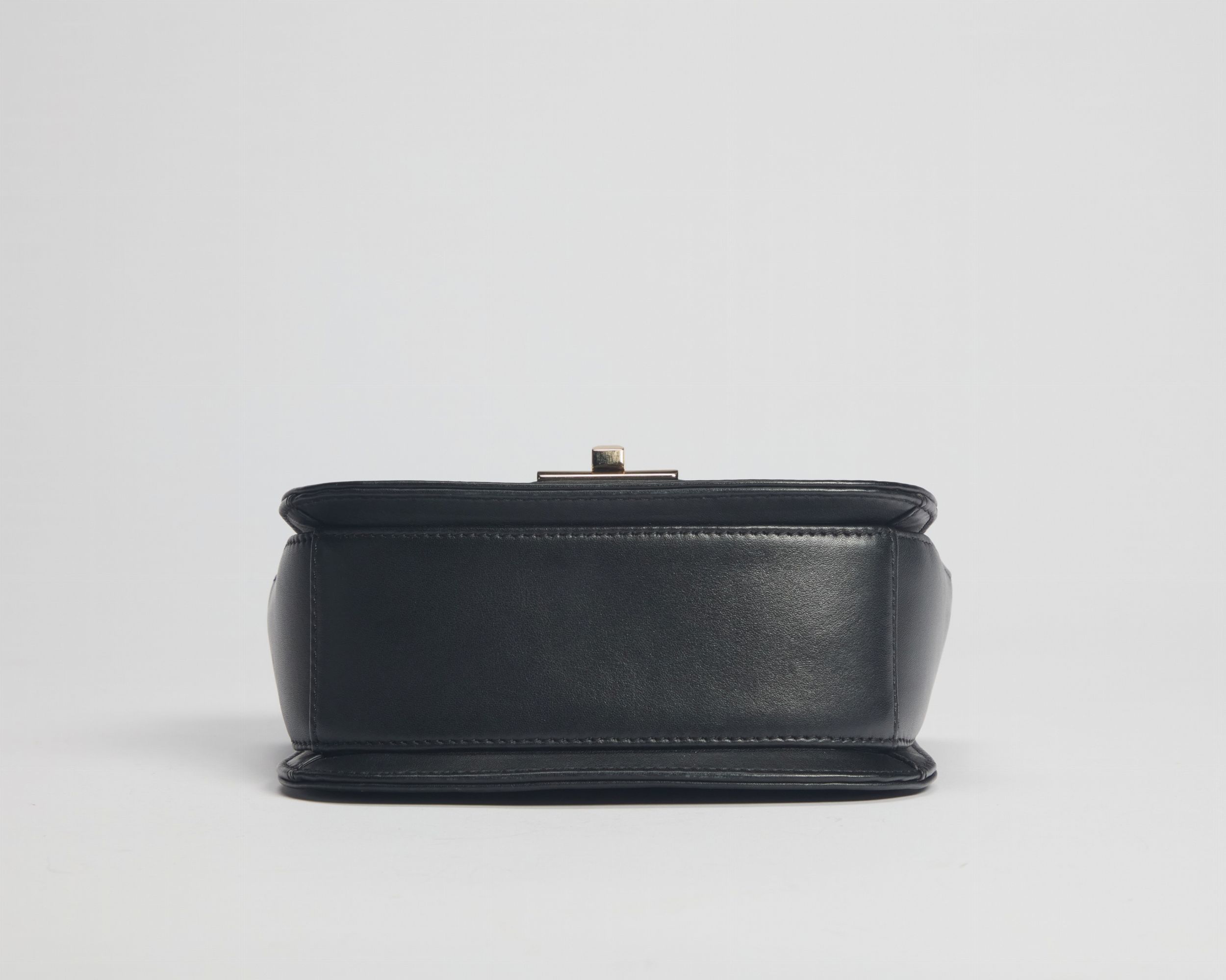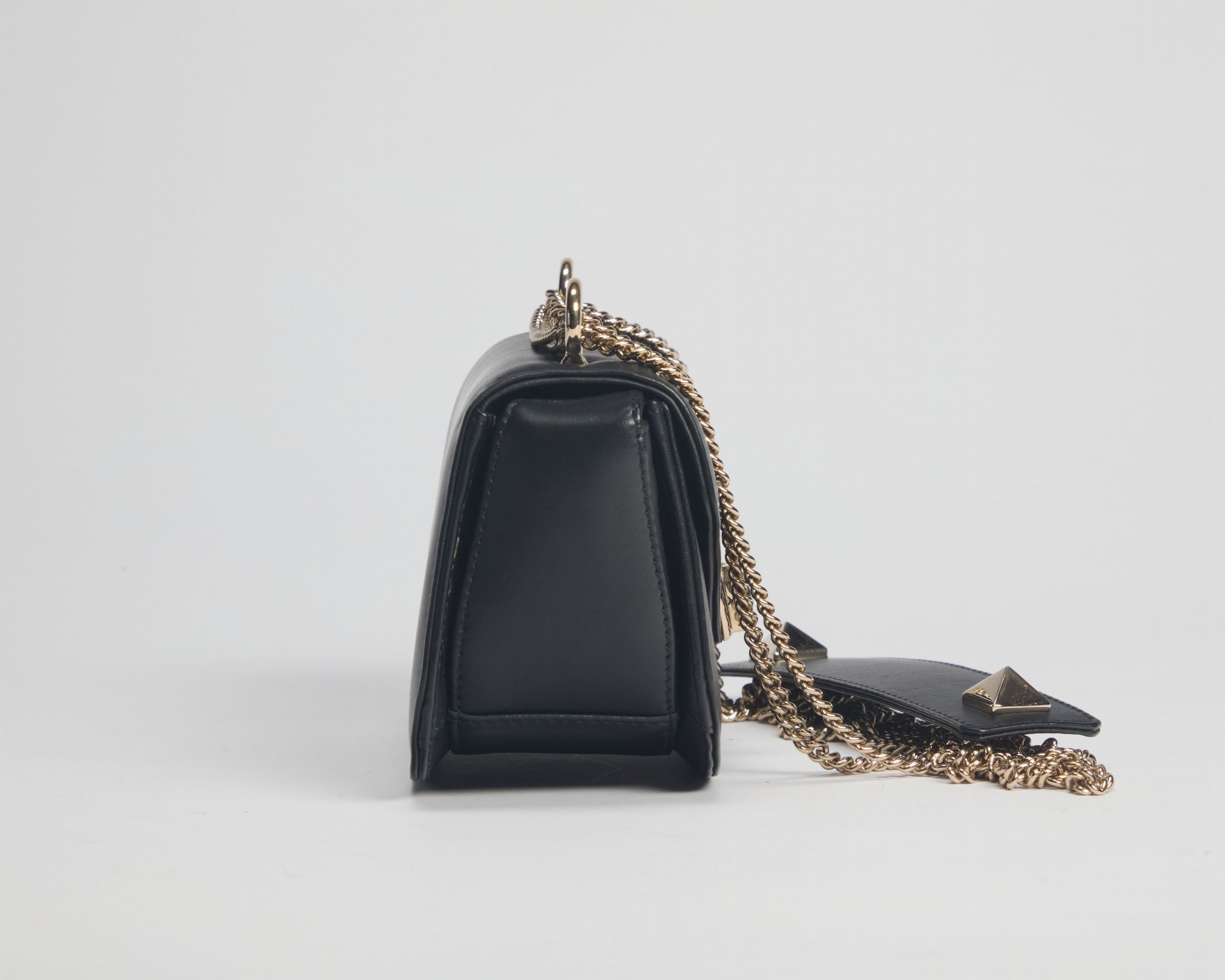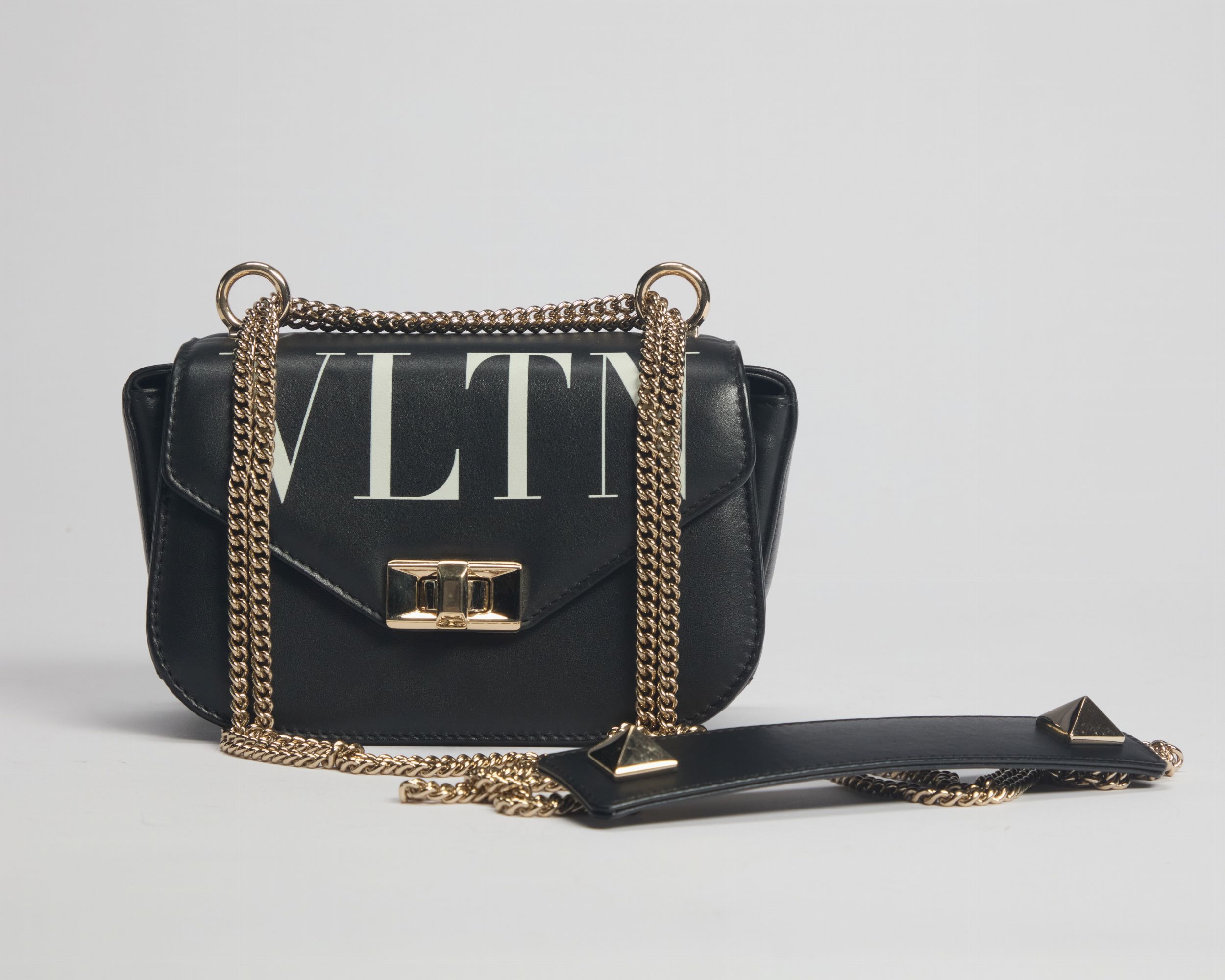 in pelle nera, con scritta VLTN bianco, tracolla a catena in metallo, cm 17 (lievi difetti), (nuova e mai usata)