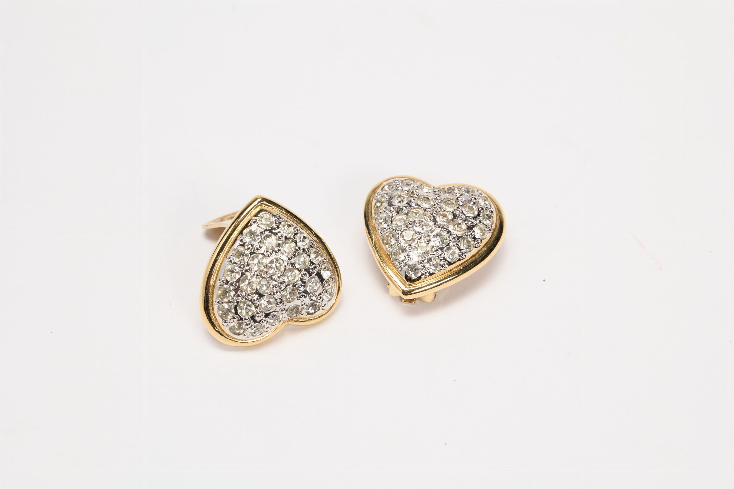 Paio di orecchini in metallo dorato e strass, a forma di cuore, con clip a lobo, cm 2,5