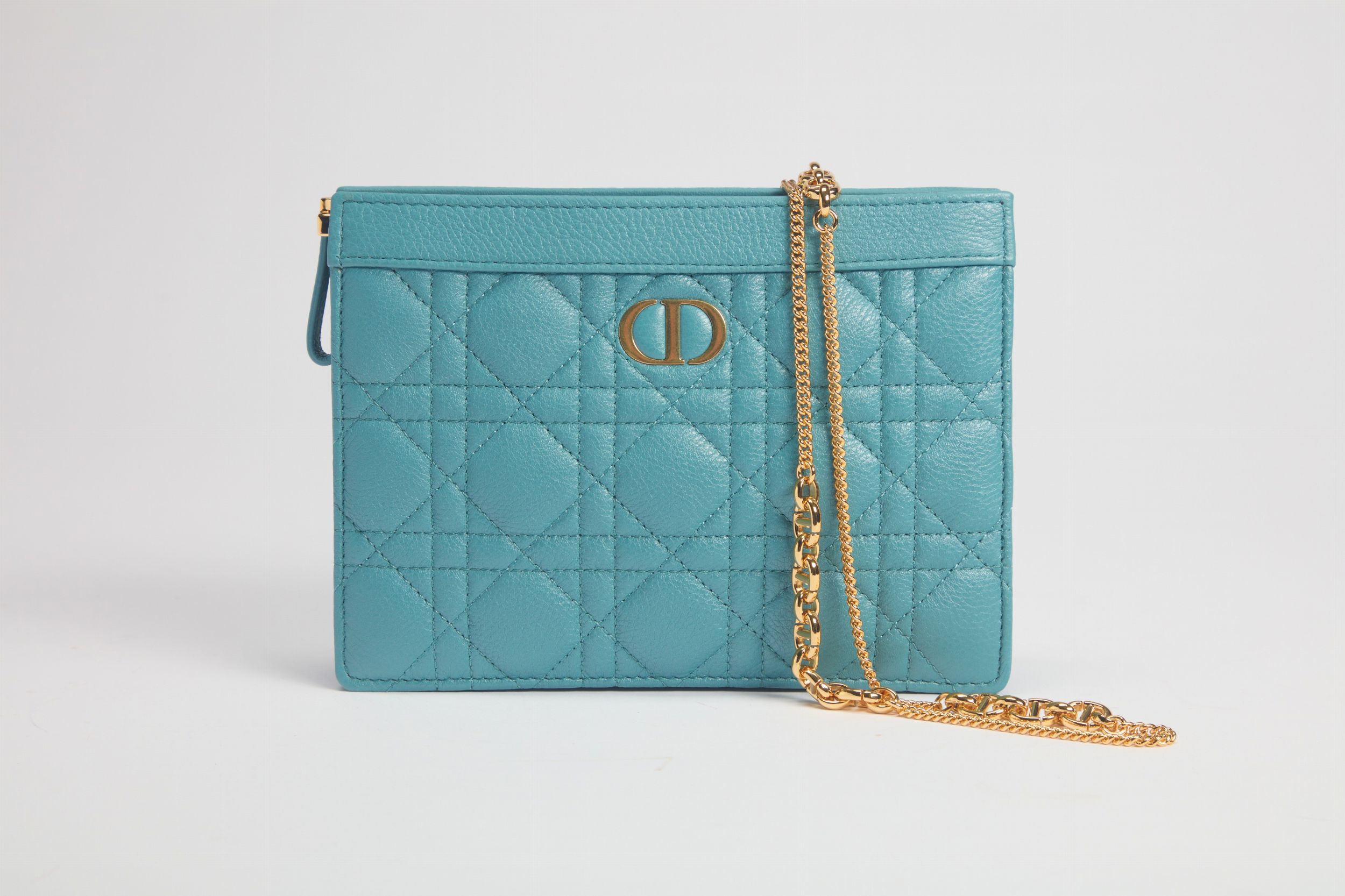 in pelle cannage color Blu Bondi con tracolla a catena staccabile, dettagli in metallo dorato, cm 19, con sacchetto