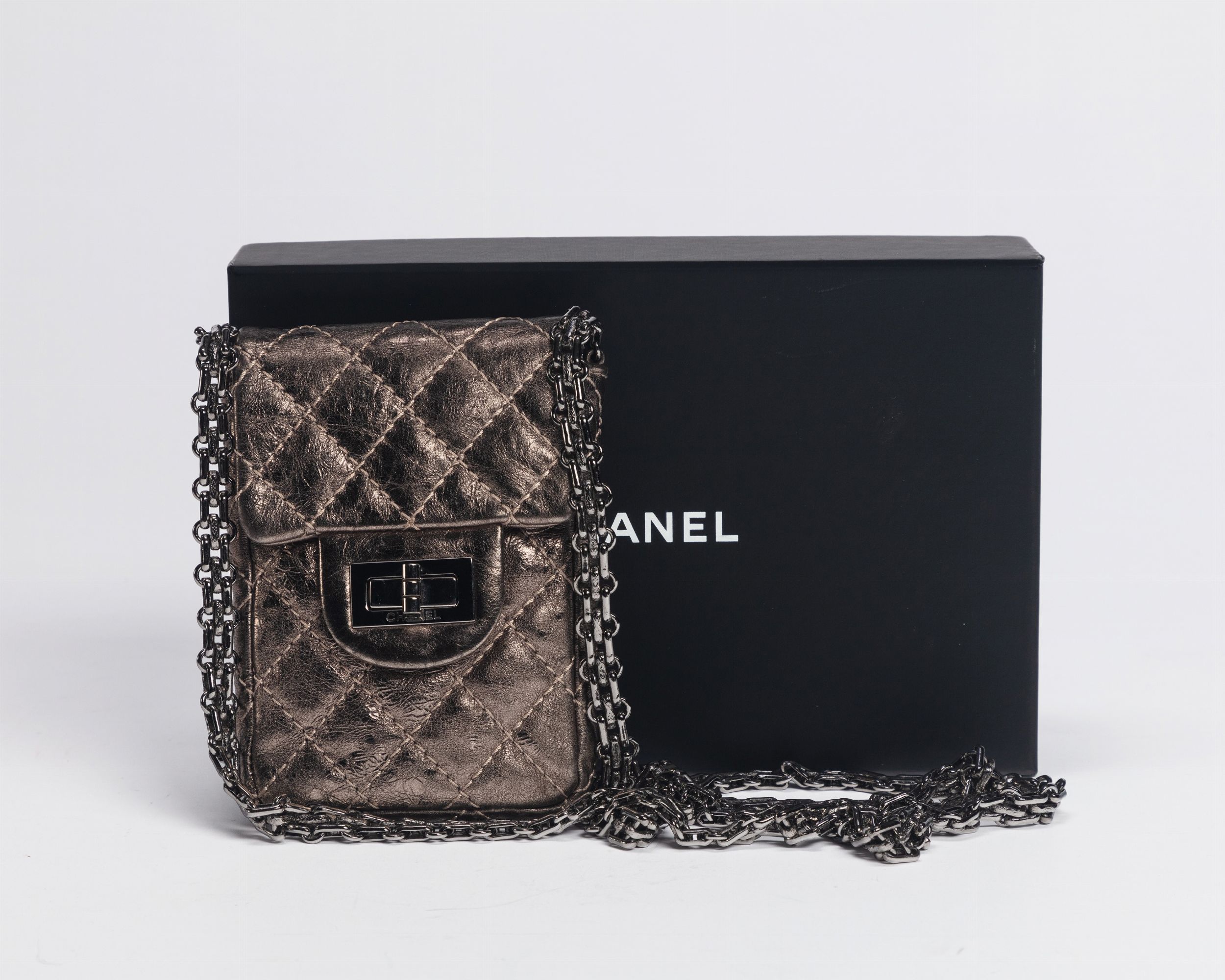 2006 in pelle matelassé color bronzo, tracolla a catena in metallo brunito, cm 9 x 13, con sacchetto e scatola