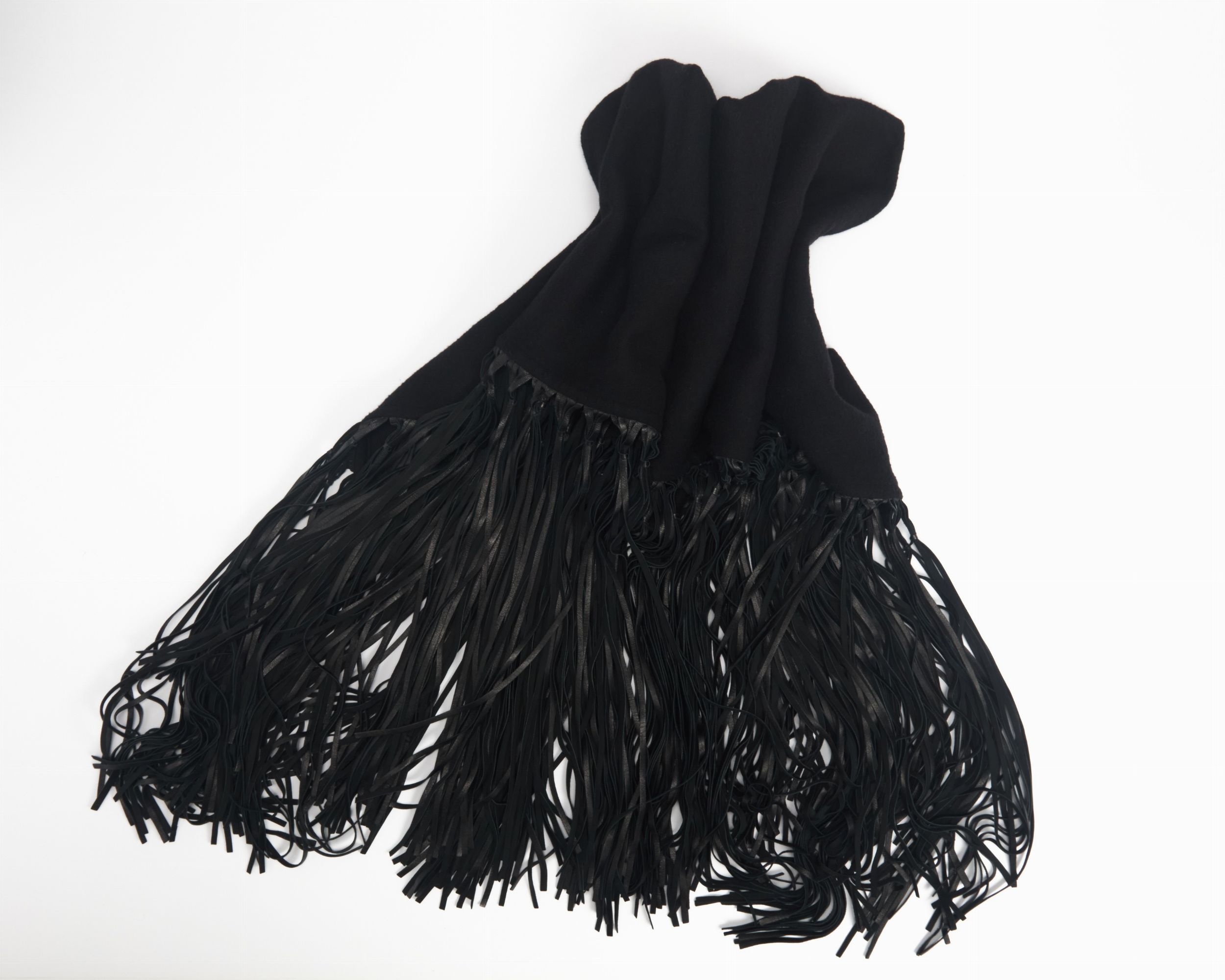 in cachemire e lana con lunghe frange in pelle color nero, base cm 200 (lievi difetti)