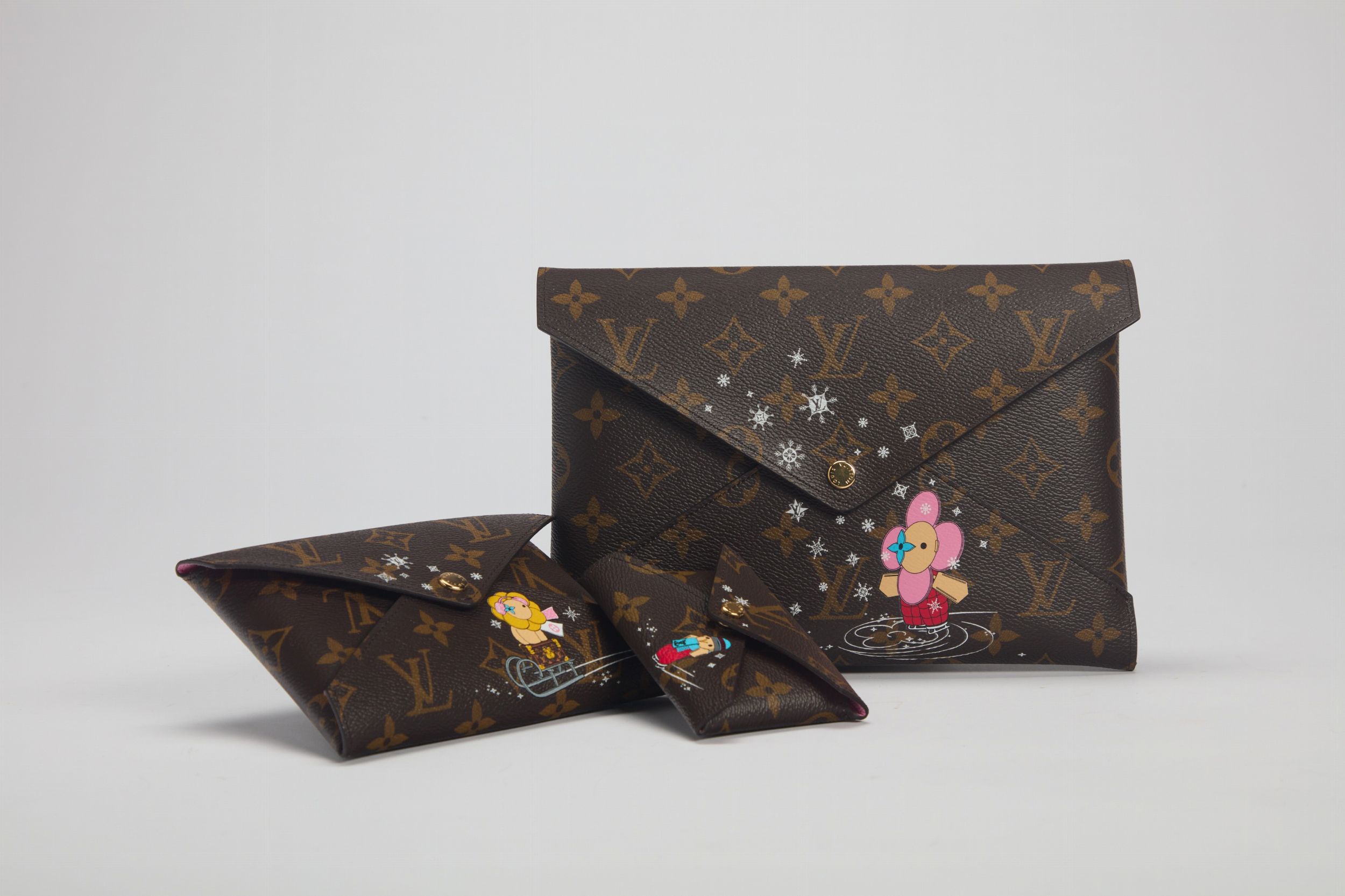 in tela monogram, con stampa Vivienne Mascotte della Maison, interno in pelle color rosa, cm 10 x 7, cm 15,5 x 11,5, cm 23 x 16,5, con sacchetto