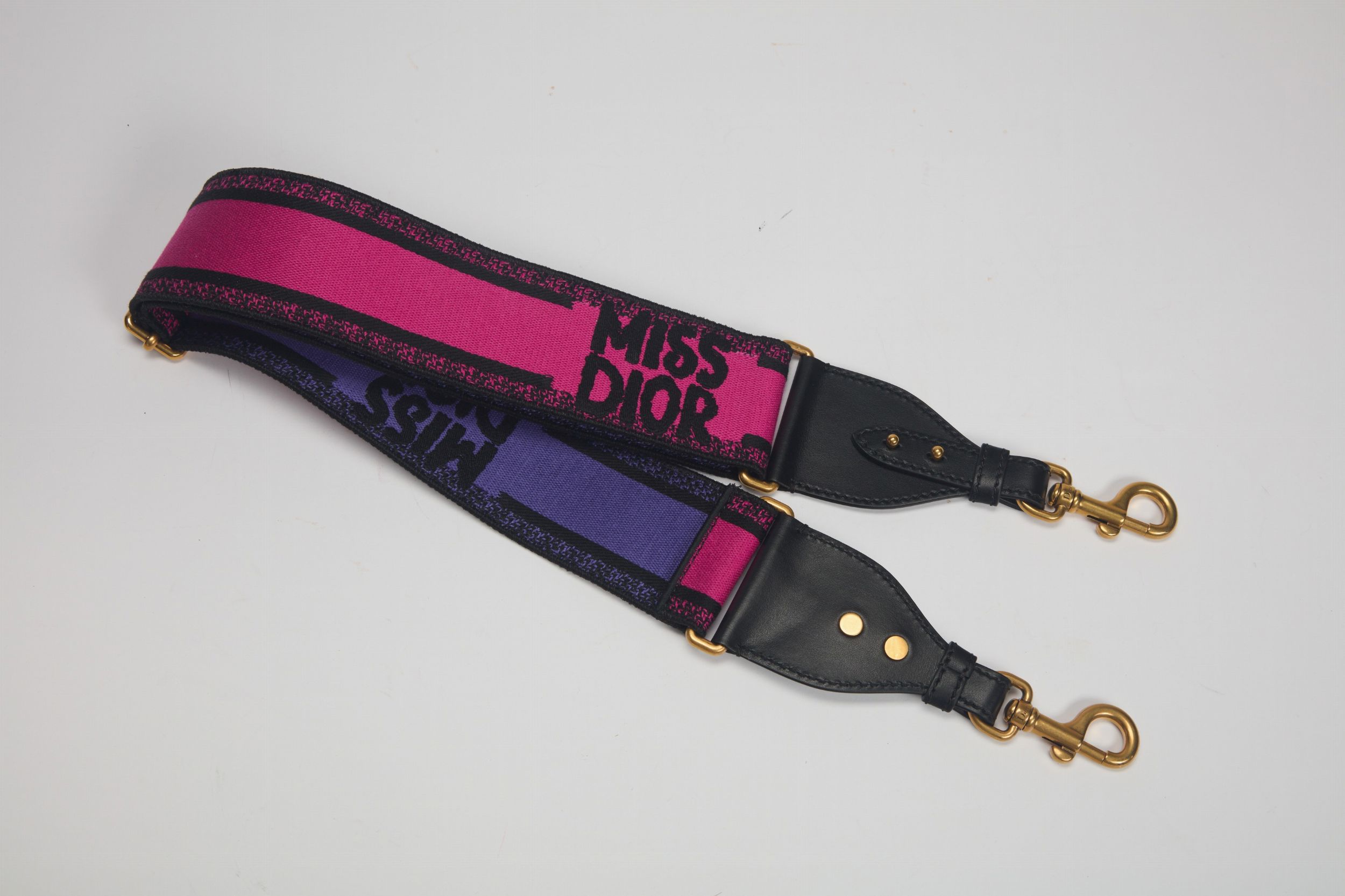 in pelle e tessuto color nero, fucsia e viola con ricami Miss Dior, dettagli in metallo dorato satinato, con sacchetto
