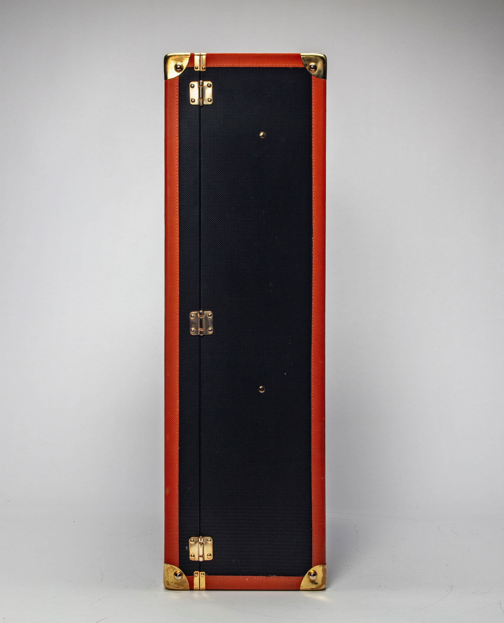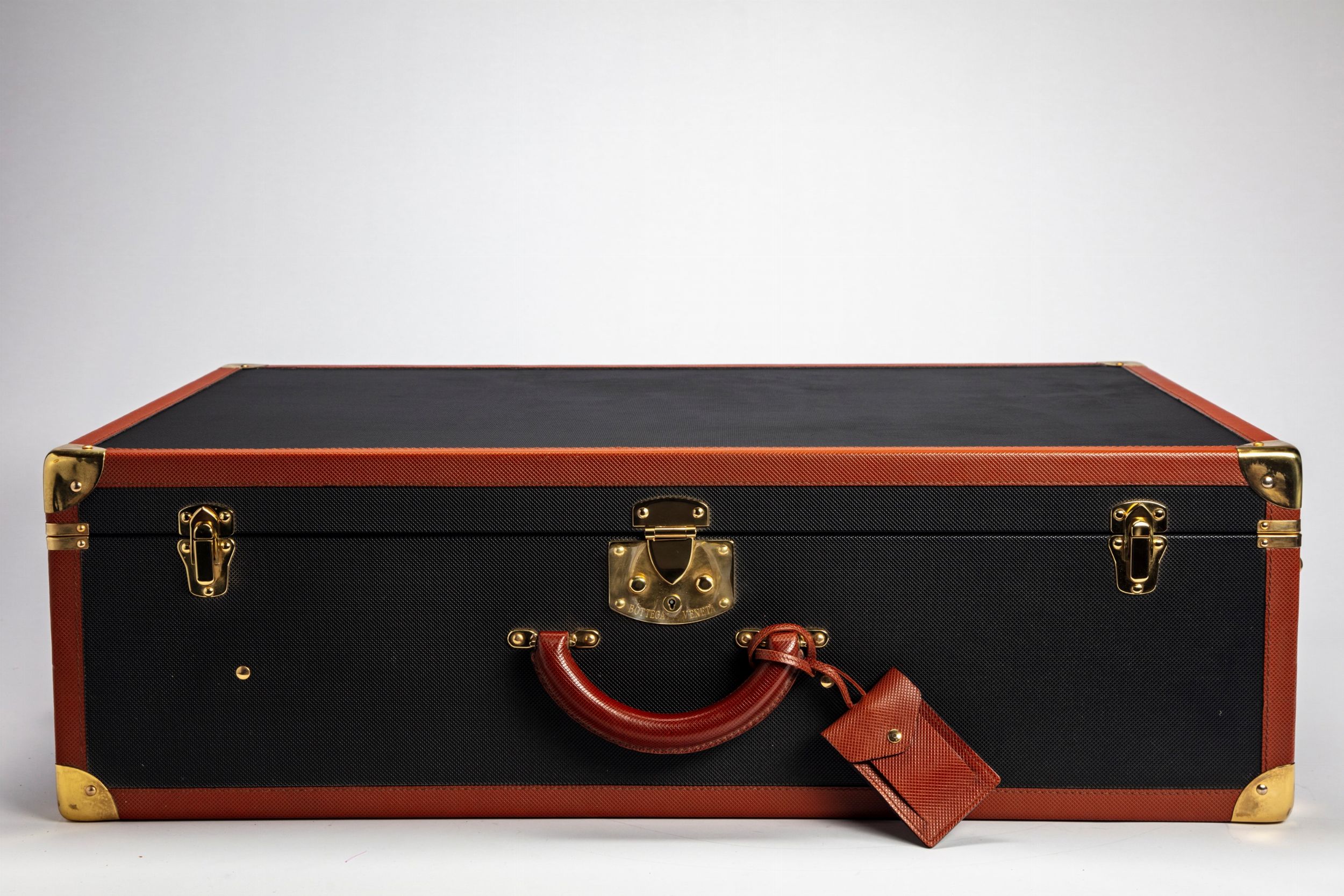 anni'90 in pelle color nero e tela, con  maniglia e profili in cuoio, angoli e chiusura in metallo dorato, interno in tela trapuntata, cinghie e quattro grucce, cm 79 x 24 x 52 (lievi difetti)