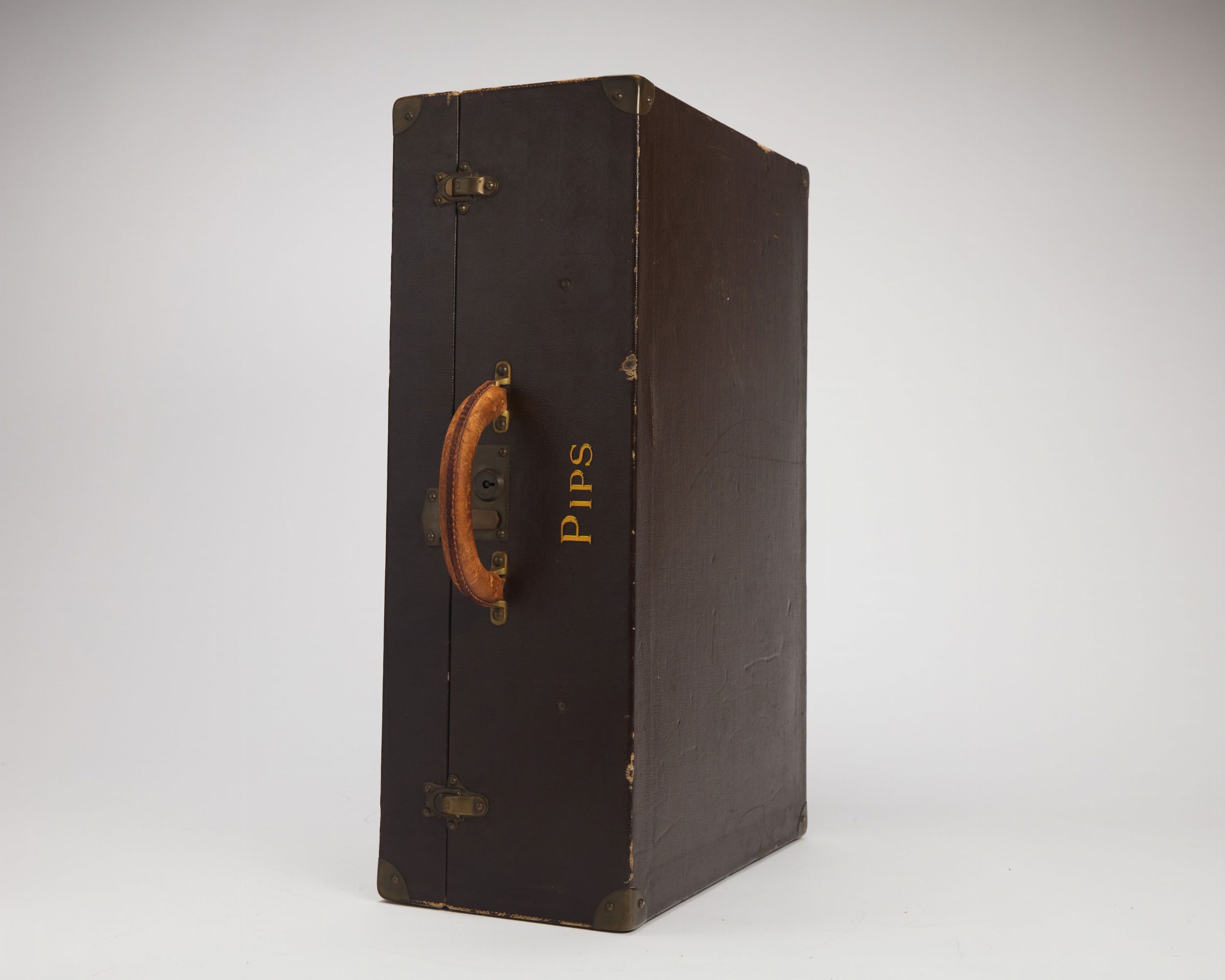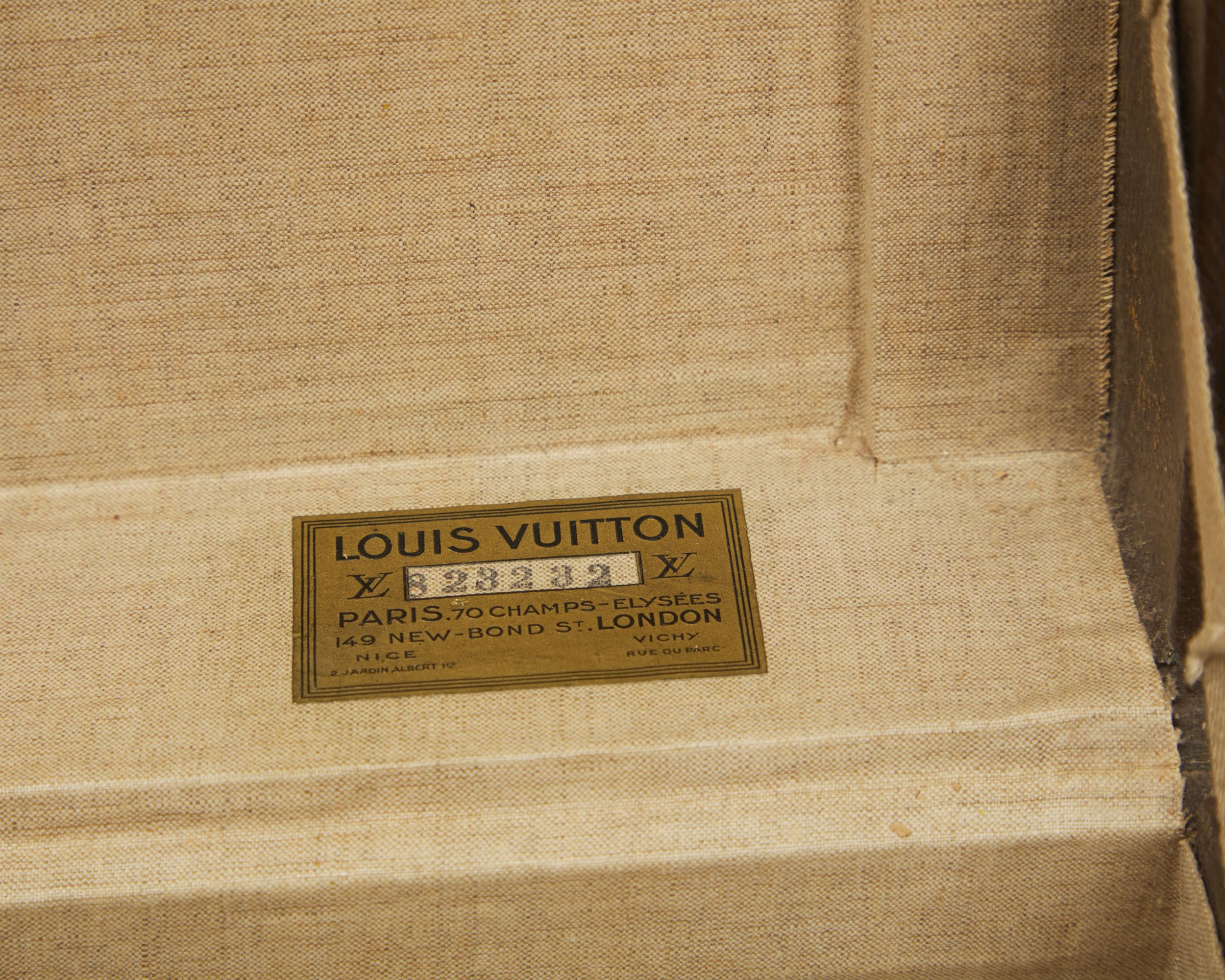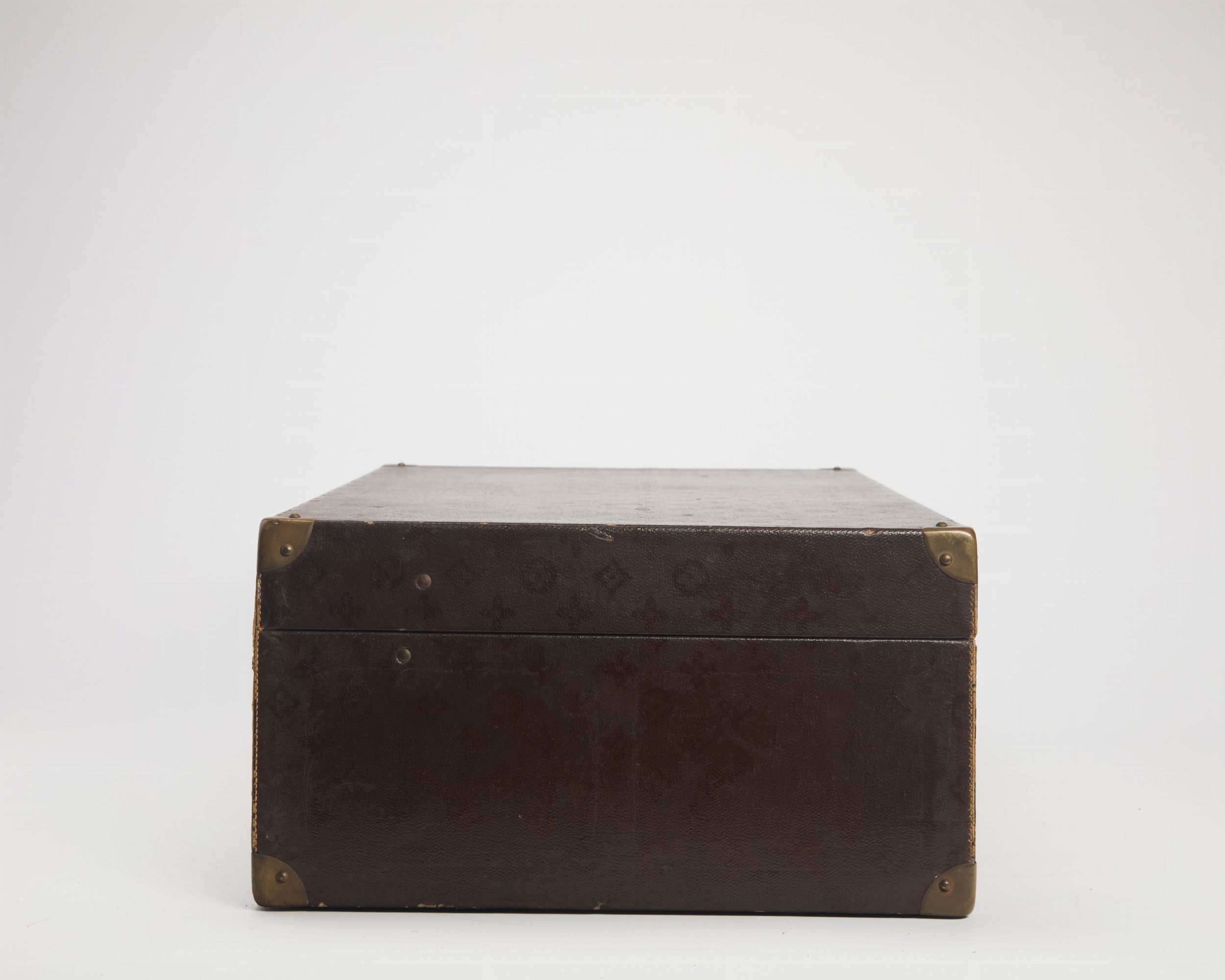 Valigia rivestita in tela monogram, maniglia in cuoio, interno con cinghie, scritta 'Pips' (difetti)