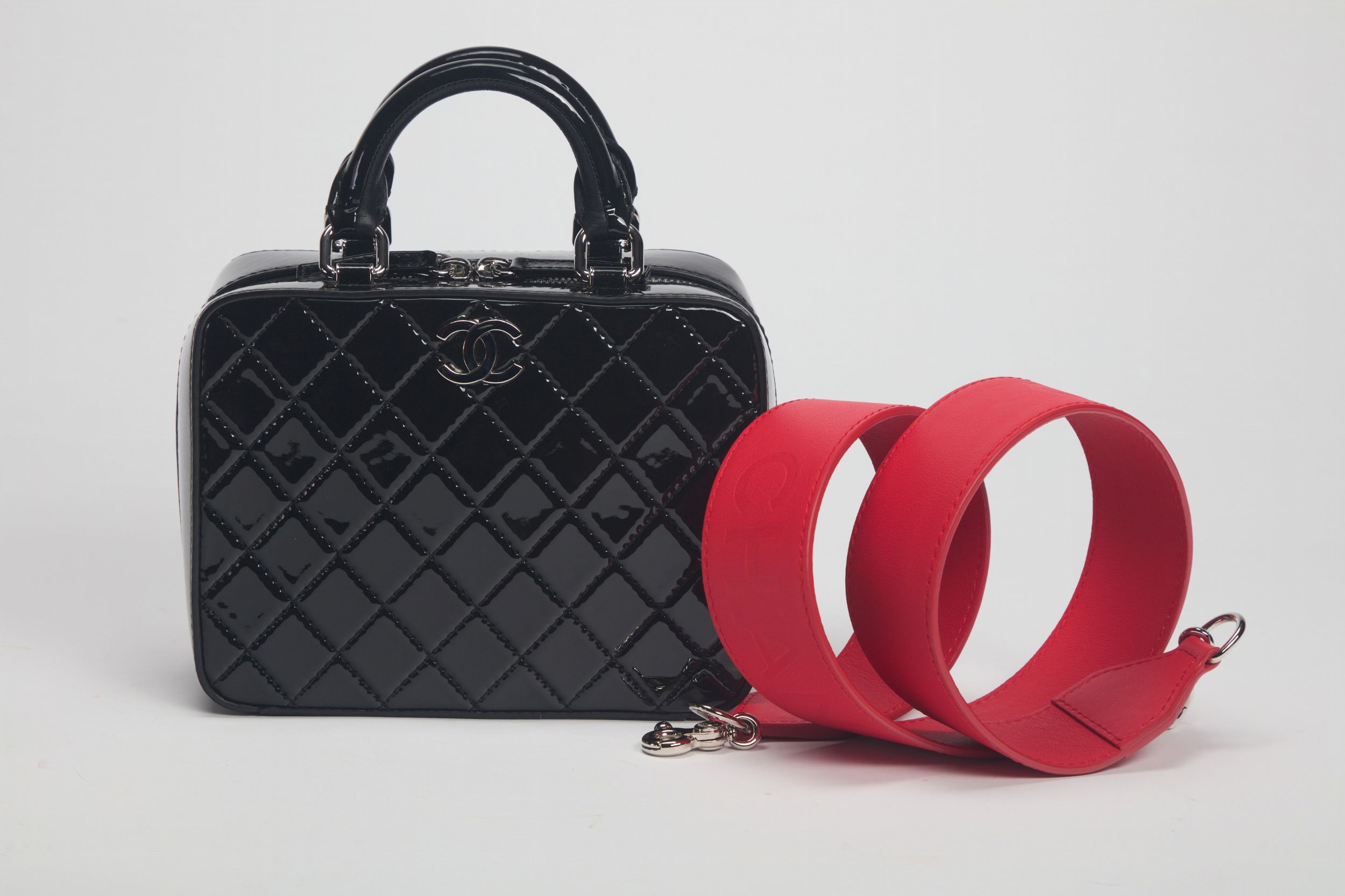 2019 in vernice matelassé color nero, con tracolla in pelle color fragola, dettagli in metallo, cm 20, con sacchetto