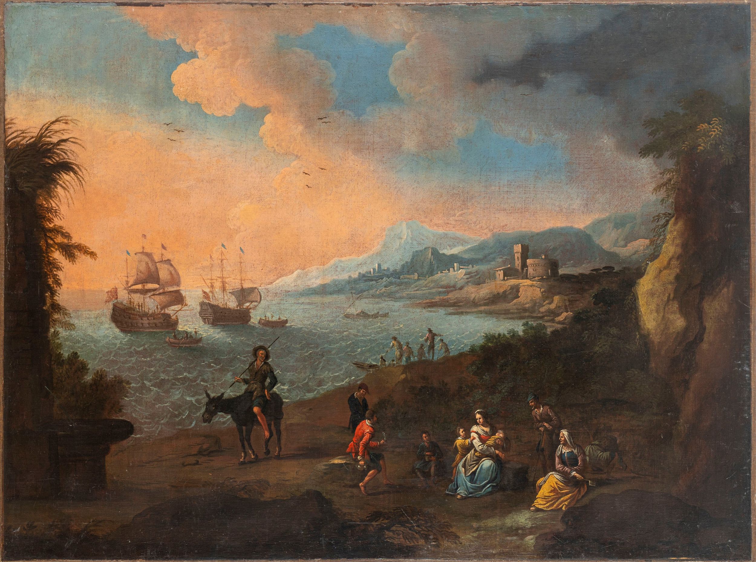Paesaggio costiero con astanti in primo piano e velieri in lontananza