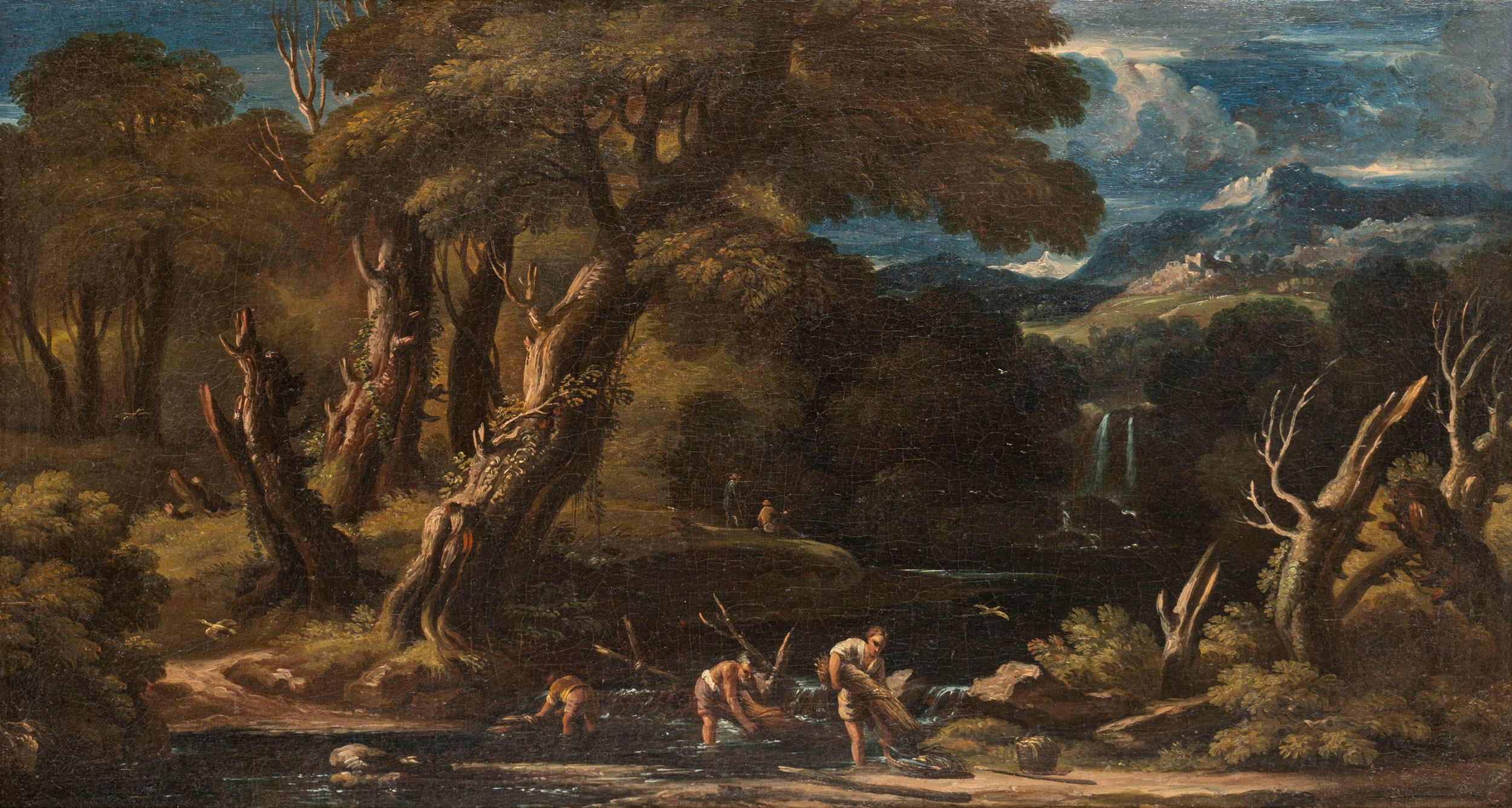 Paesaggio fluviale con pescatori in riva e cascata sullo sfondo