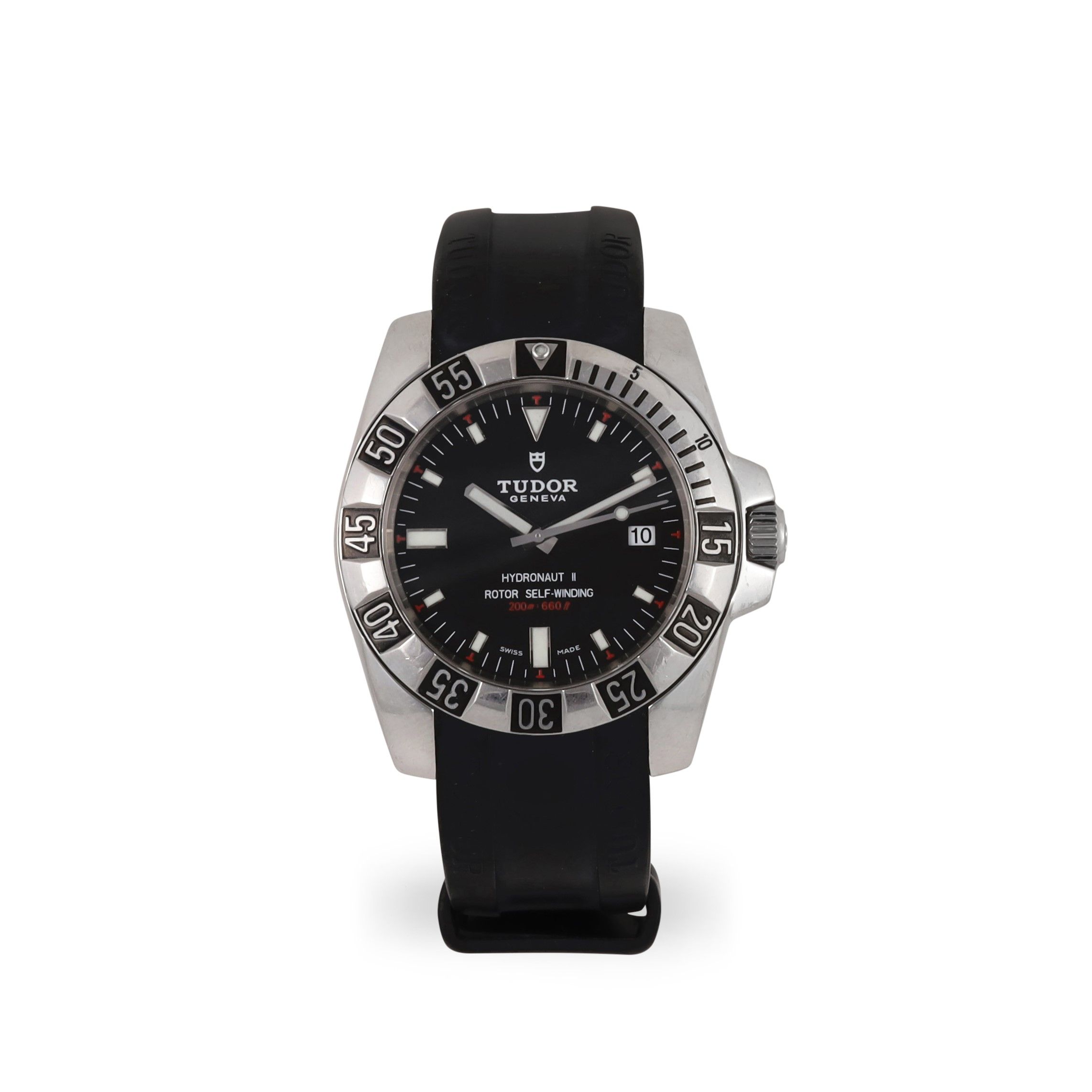 Ref: 'Hydronaut II' Cassa: in acciaio, fondello a vite. Vetro zaffiro Quadrante: nero, indici a bastone luminosi, datario. Sfere a bastone Movimento: automatico, firmato Cinturino: originale con chiusura deployante Anno: 2000 circa DIAM: 41 mm Accessori: scatola originale Nota: fondello con incisione