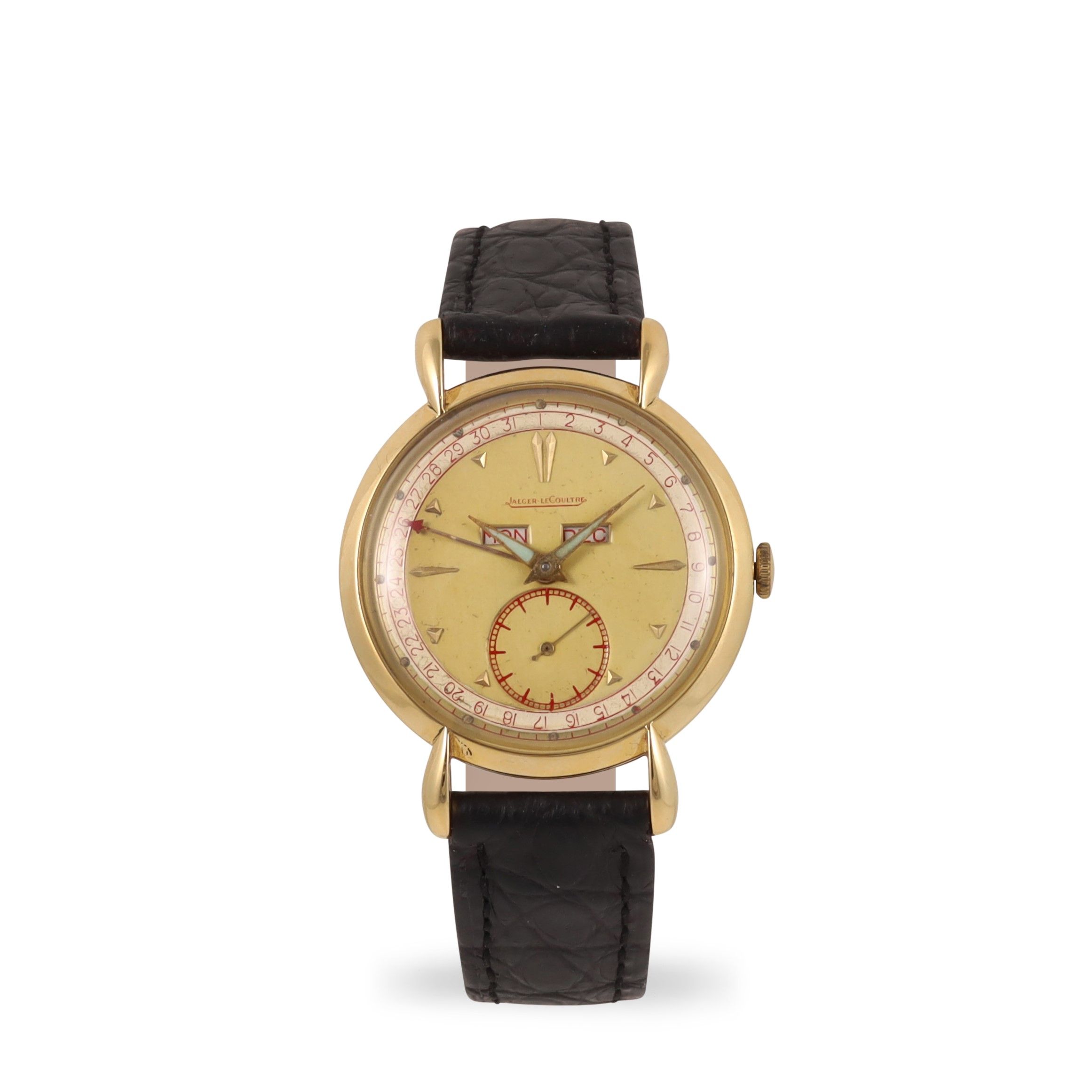 Cassa: in oro giallo 18K, fondello a pressione Quadrante: champagne, indici a dardo, contatore ausiliare dei secondi, apertura per giorno e mese. Sfere Dauphine Movimento: manuale, firmato DIAM: 35 mm Anno: 1960 circa Nota: quadrante ristampato