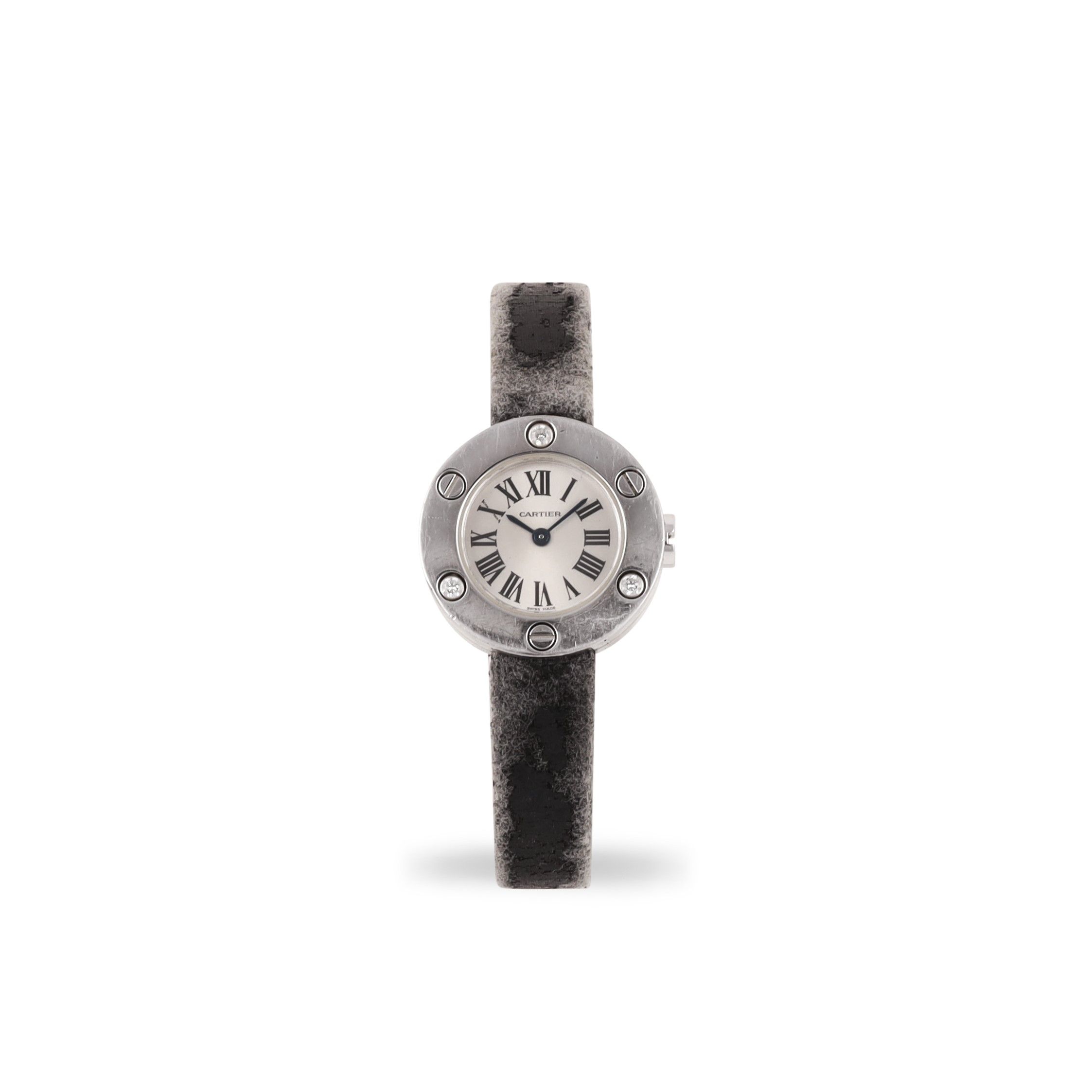 Ref: 2974, 'Love' Cassa: in oro bianco 18K, lunetta serrata da viti e brillanti, fondello serrato da viti. Vetro zaffiro Quadrante: argento, numeri Romani. Sfere a bastone Movimento: al quarzo Cinturino: originale con fibbia in oro firmata Anno: 2000 circa DIAM: 23 mm Accessori: scatola e sacchetto Cartier
