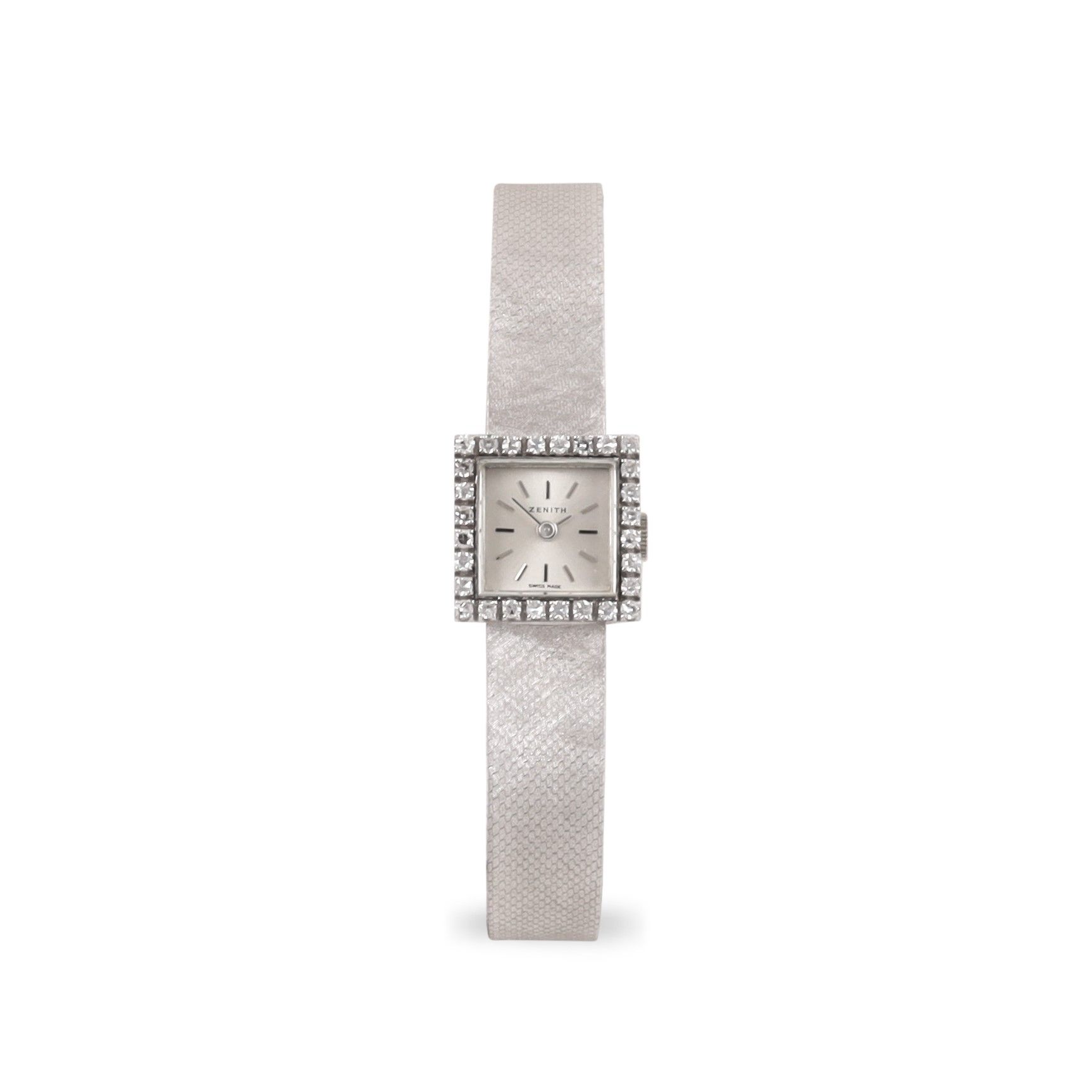 Cassa: in oro bianco 18K, lunetta in brillanti, fondello a pressione Quadrante: argento, indici a bastone. Sfere a bastone Movimento: manuale, firmato Anno: 1960 circa Bracciale: originale in oro Lunghezza bracciale: 165 mm DIM: 16 x 16 mm Accessori: scatola originale Gr: 43