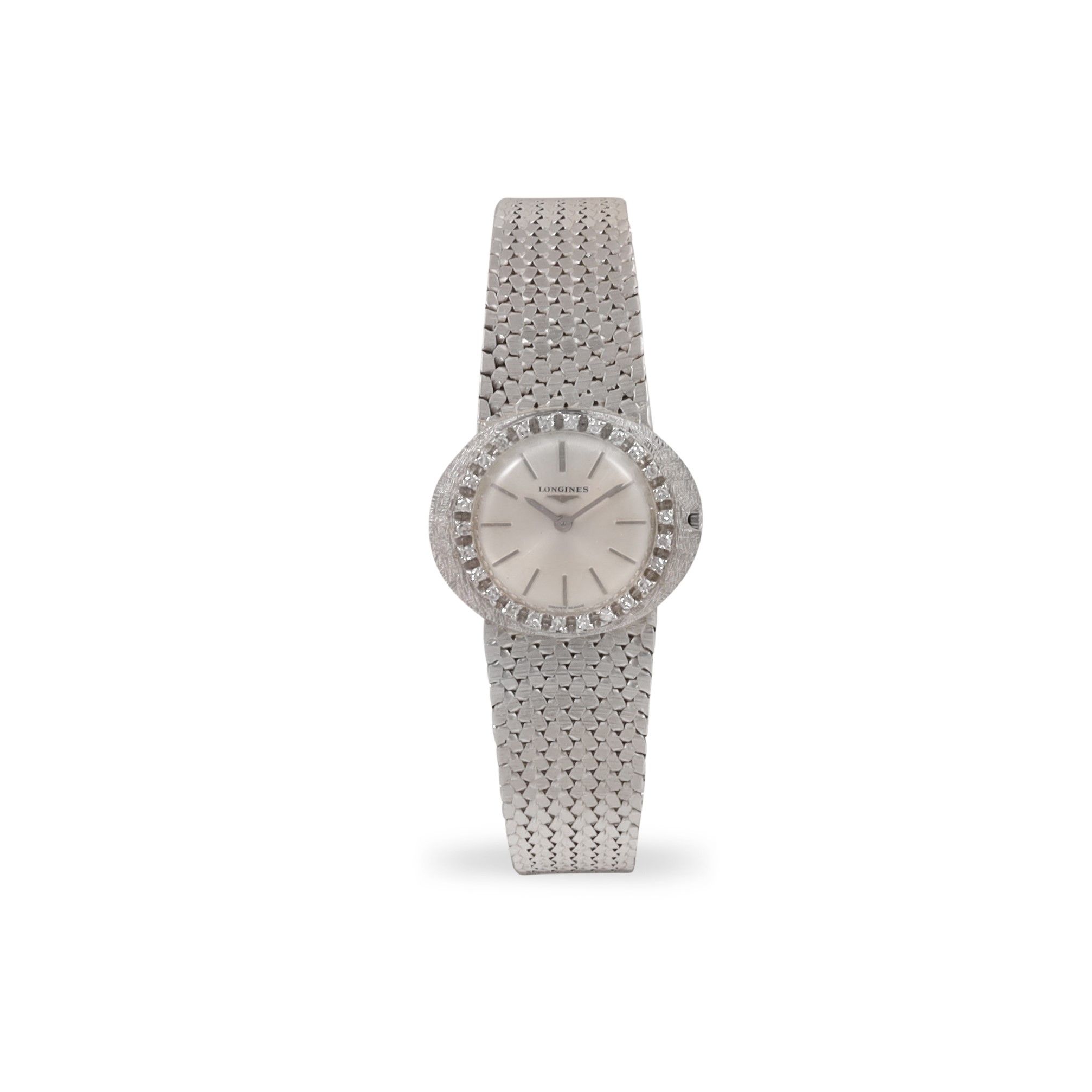 Cassa: in oro bianco 18K e lunetta in brillanti, fondello a pressione Quadrante: argento, indici a bastone. Sfere a bastone Movimento: manuale Bracciale: in oro bianco 18K non originale Anno: 1960 DIAM: 25 mm Gr: 38