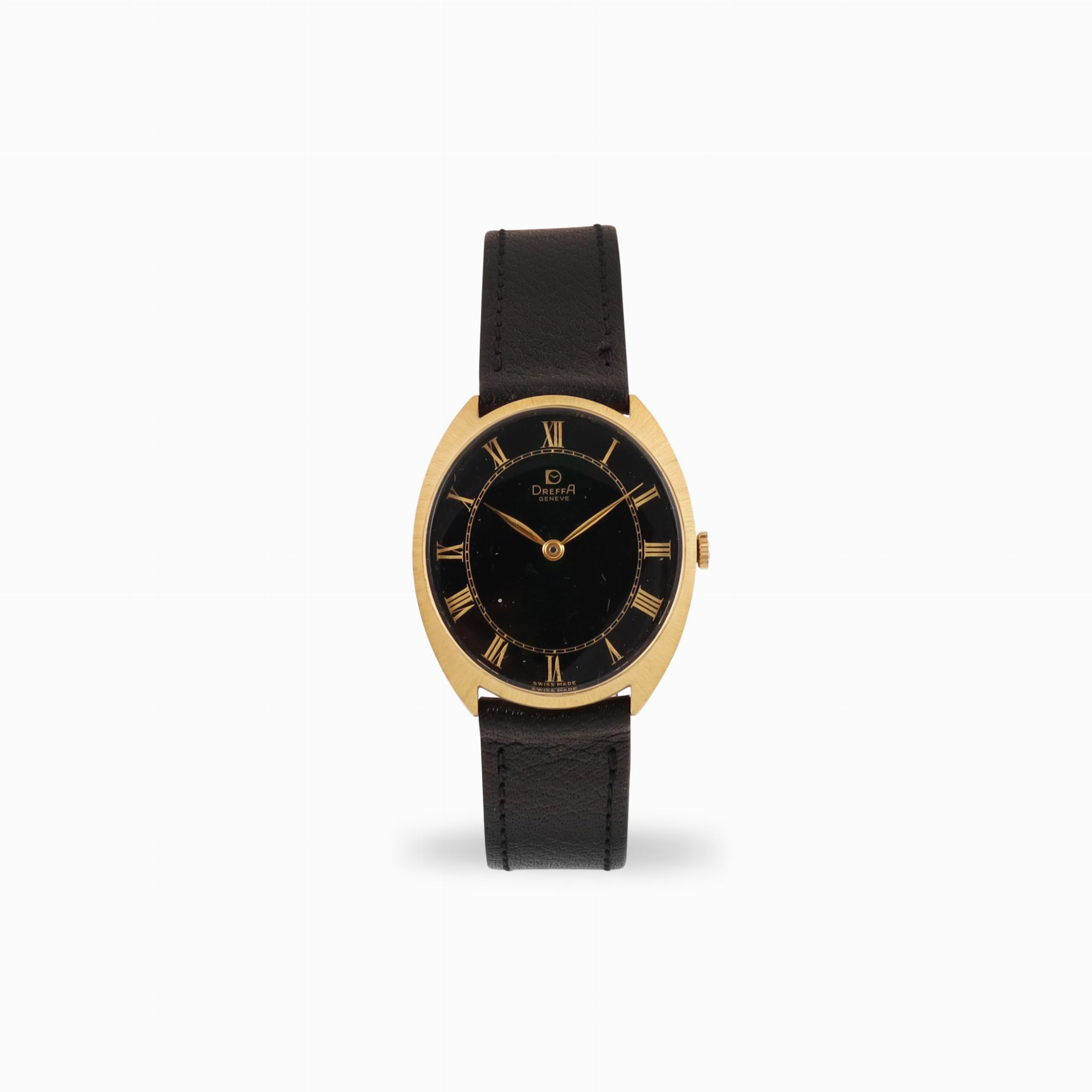Cassa: in oro giallo 18K, fondello a pressione Quadrante: nero con numeri Romani. Sfere a foglia Movimento: manuale Anno: 1970 circa DIM: 33 x 30 mm