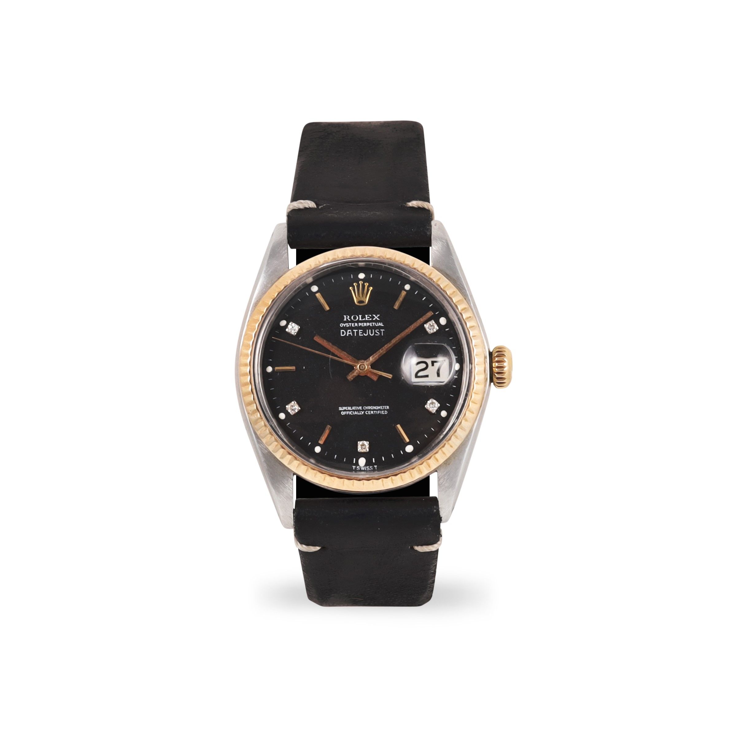 Ref: 1601, 'Datejust' Cassa: in acciaio e oro, fondello a vite Quadrante: nero, indici a bastone e brillanti, datario. Sfere a bastone Movimento: automatico Cinturino: fibbia originale placcata Anno: 1976 circa DIAM: 36 mm Nota: quadrante 'Aftermarket'