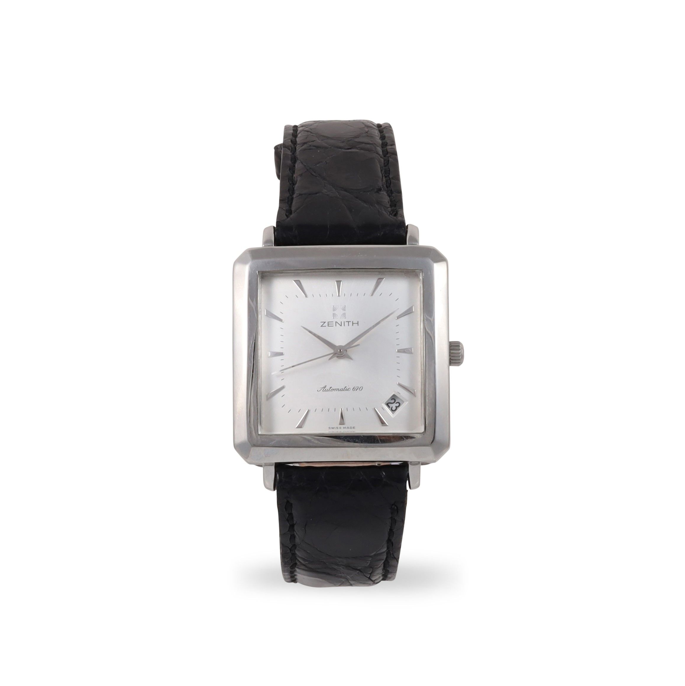 Ref: 'Elite Carrè', 670 Cassa: in acciaio, fondello a pressione Quadrante: argento, indici a dardo, datario. Sfere Dauphine Movimento: automatico, firmato, cal. 670 Cinturino: fibbia originale Anno: 1990 circa DIM: 33 x 40 mm