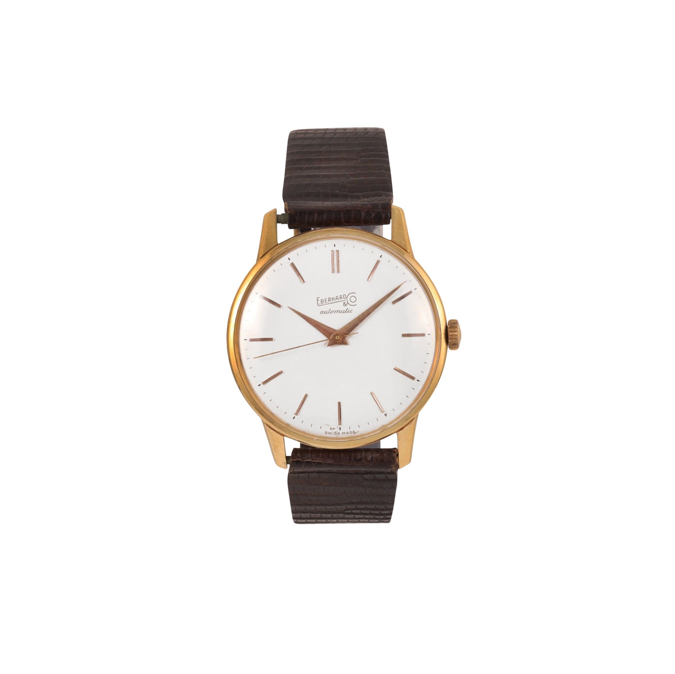 Cassa: in oro giallo 18K, fondello a pressione Quadrante: argento, indici a bastone. Sfere Dauphine Movimento: automatico, firmato Cinturino: fibbia AW in oro Anno: 1960 circa DIAM: 35 mm Accessori: astuccio originale