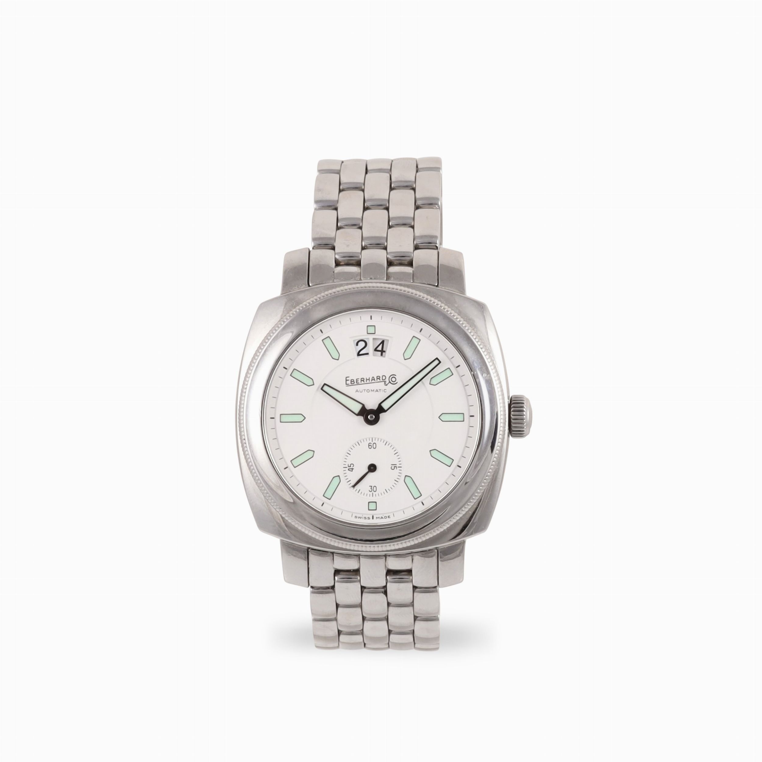 Ref: 41020, 'Boucanier' Cassa: in acciaio, fondello trasparente con movimento a vista, serrato da viti. Vetro zaffiro Quadrante: Bianco, indici luminosi a bastone, grand data. Sfere luminose Movimento: automatico Bracciale: originale con chiusura deployante Anno: 2000 circa Accessori: astuccio Eberhard DIAM: 40 mm
