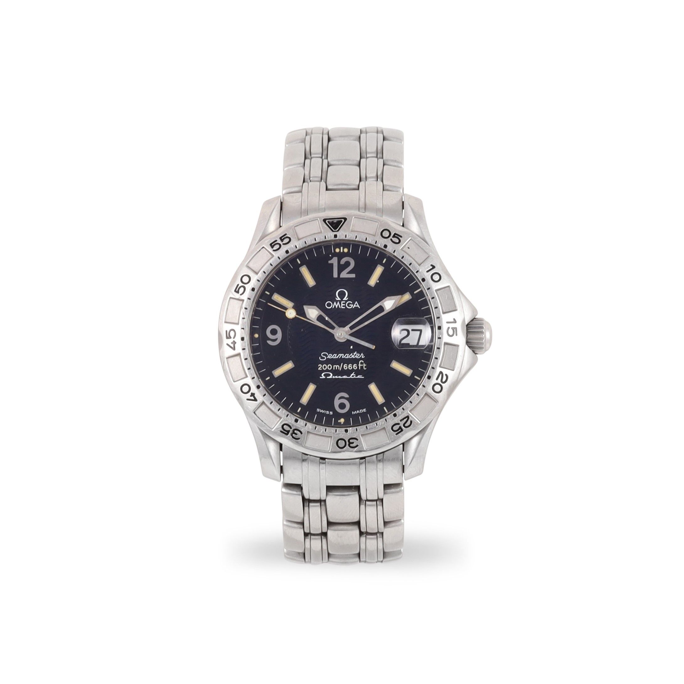 Ref: 196.1526, 'Seamaster Matic' Cassa: in acciaio, fondello a vite. Vetro zaffiro Quadrante: nero, indici a bastone luminosi, numeri Arabi, datario. Sfere a gladio Movimento: al quarzo, cal. 1400 Bracciale: originale con chiusura deployante Lunghezza complessiva: 185 mm Anno: 1995 circa DIAM: 36 mm