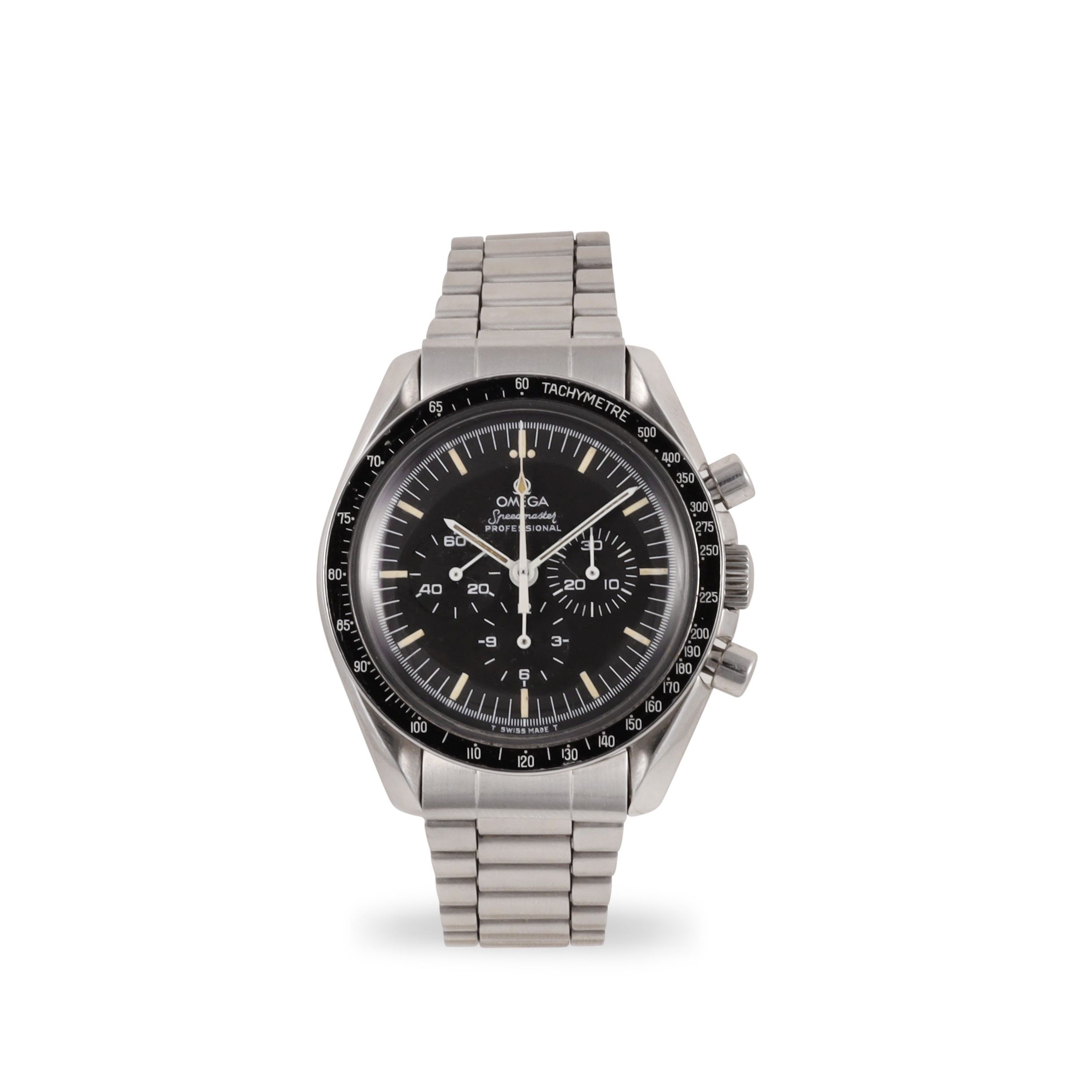 Ref: 145022, 'Speedmaster Professional' Cassa: in acciaio, fondello a vite con logo Quadrante: nero con indici luminosi a bastone, contatori per i secondi 12 ore e 30 minuti. Sfere a bastone Movimento: manuale, cal. 861 Bracciale: in acciaio 1171/633 Anno: 1980 circa DIAM: 42 mm