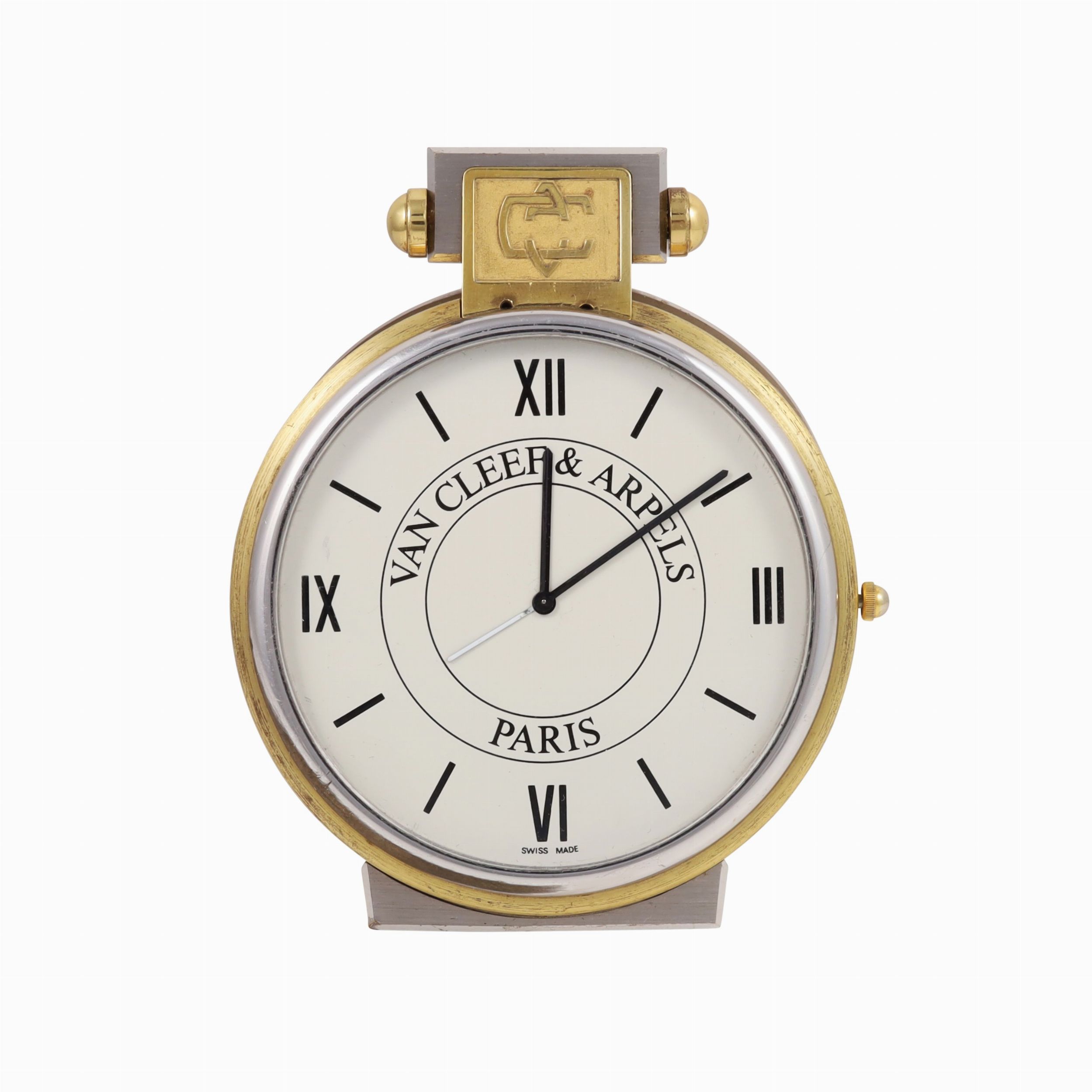 Ref: 820. P06 Cassa: in acciaio e metallo dorato Quadrante: bianco con numeri Romani. Sfere a bastone Movimento: al quarzo Anno: 1990 circa DIAM: 7 cm