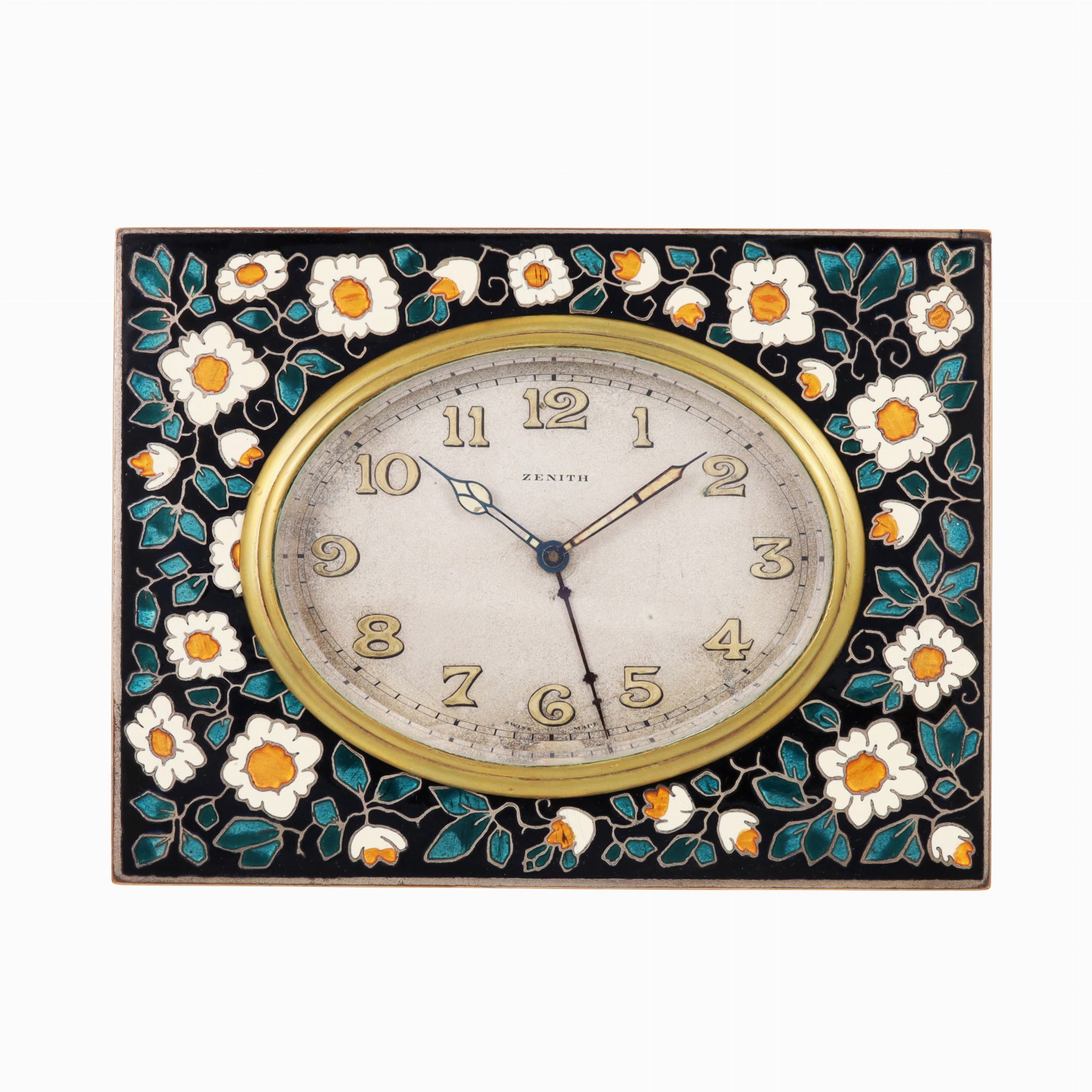 Cassa: in ottone dorato con smalti Quadrante: argento, numeri Arabi. Sfere scheletrate luminose Movimento: manuale Anno: 1930 circa DIM: 12 x 9 cm