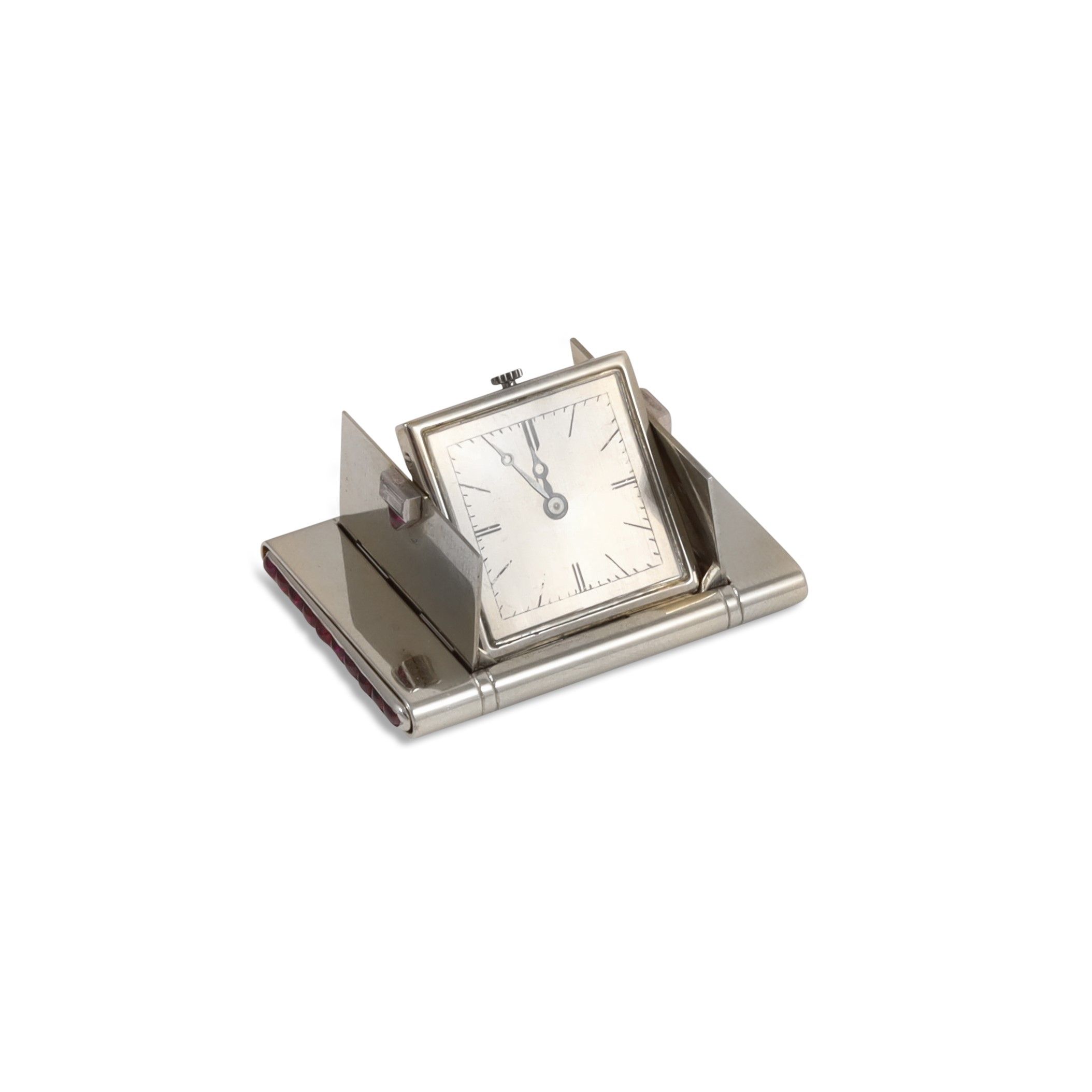 Ref: 'La Captive' Cassa: con apertura a scomparsa, numerata, in oro bianco, brillanti e rubini Quadrante: argento, indici a bastone. Sfere tipo Breguet Movimento: firmato Mauboussin Anno: 1930 circa DIM: 36 x 24 mm Nota: da revisionare