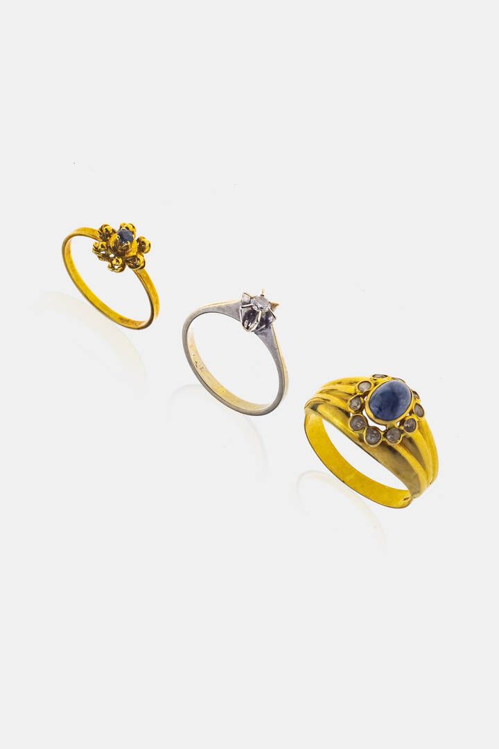 -in oro giallo con zaffiro centrale sommità a fiore. Peso gr 1 7. Misura 13 (53) -in oro bianco al centro diamante solitario di ct 0 08 ca. Peso gr 1 9. Misura 12 (52) -in oro giallo con zirconi e zaffiro cabochon. Peso gr 2 7. Misura 16 (56)