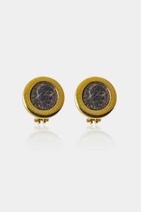 Peso gr 12 2 Diam. cm 1 9 in oro giallo di forma rotonda con al centro due monete antiche.