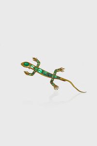 Peso gr 6 Cm 7x2 in oro giallo a forma di lucertola con smeraldi taglio ottagonale a gradini e cabochon per [..]