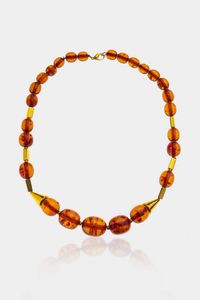 Peso gr 58 Lunghezza cm 52 composta da sfere ovali di ambra. Chiusura e distanziali in oro giallo.