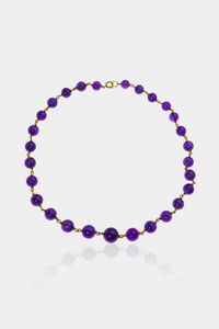 Peso gr 47 5 Lunghezza cm 46 composta da sfere di ametiste a scalare dal diam. 13 a 8 5 mm. Chiusura in oro giallo [..]