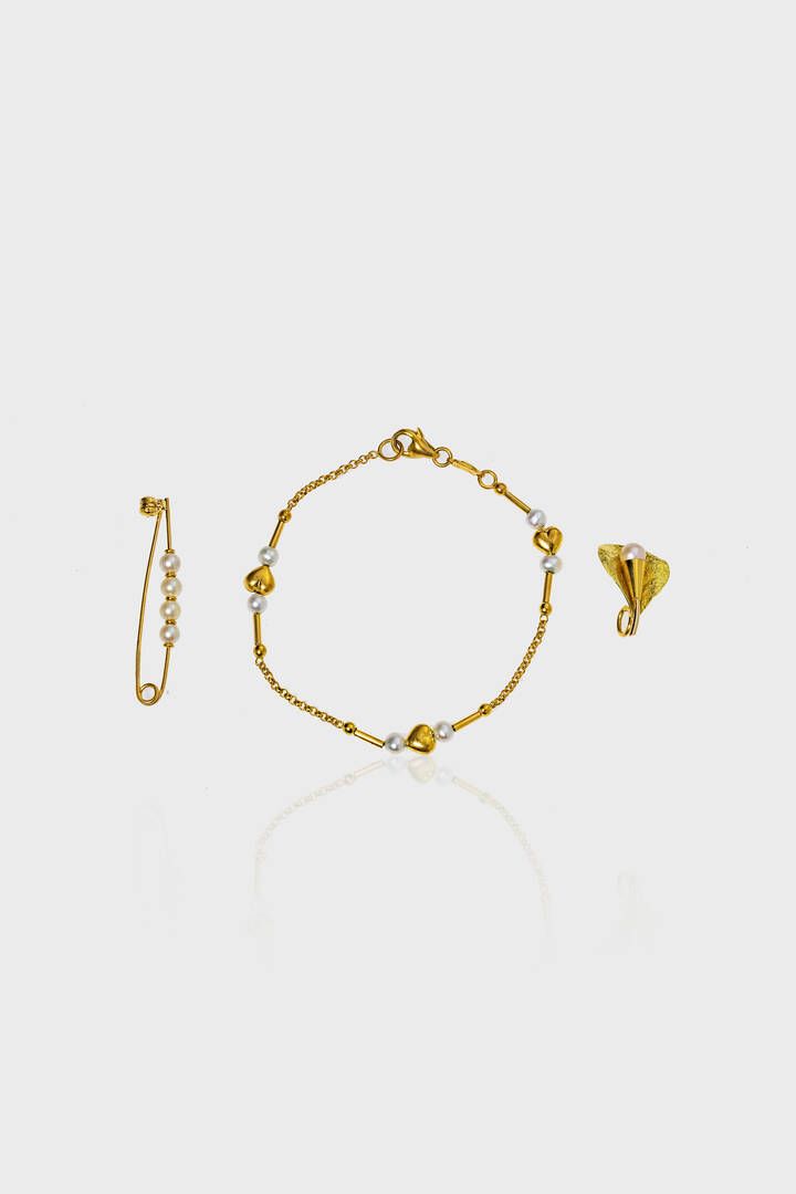 in oro giallo: -braccialetto con cuori e perline. Peso gr 4 7 -ciondolo a forma di calla. Peso gr 2 -spilla a barretta con perline. Peso gr 1 6
