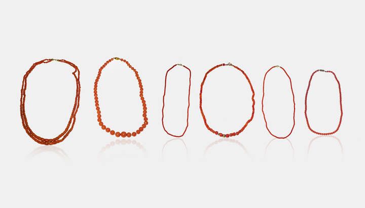 Lunghezza cm 40-57-50-57-47-47 mediterraneo dai toni del salmone al rosso; con sfere e barilotti a scalare di varie dimensioni. Cinque con chiusura in oro giallo e una in metallo.