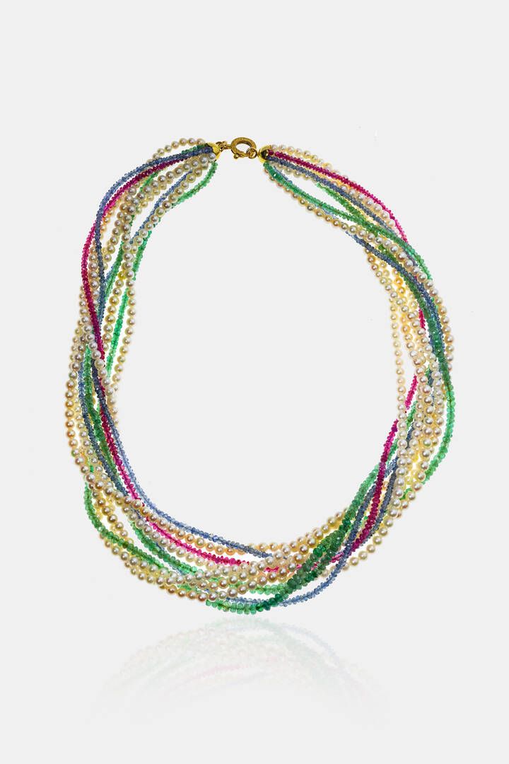 Lunghezza cm 44 composto da cinque fili di perle giapponesi del diam di mm 3 5-4; due fili di sfere briolette di zaffiri rubini e smeraldi. Chiusura in oro giallo ad anello.