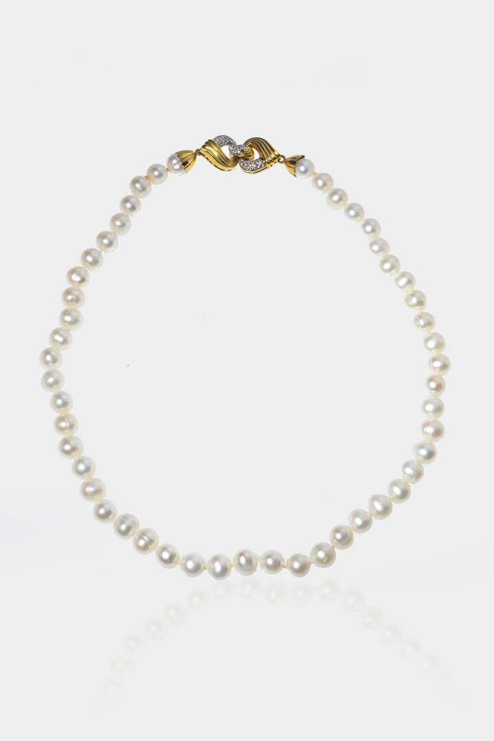 Lunghezza cm 49 composto da un filo di acqua dolce del diam. di mm 10 ca. Chiusura in oro giallo con diamanti taglio brillante per totali ct 0 40 ca
