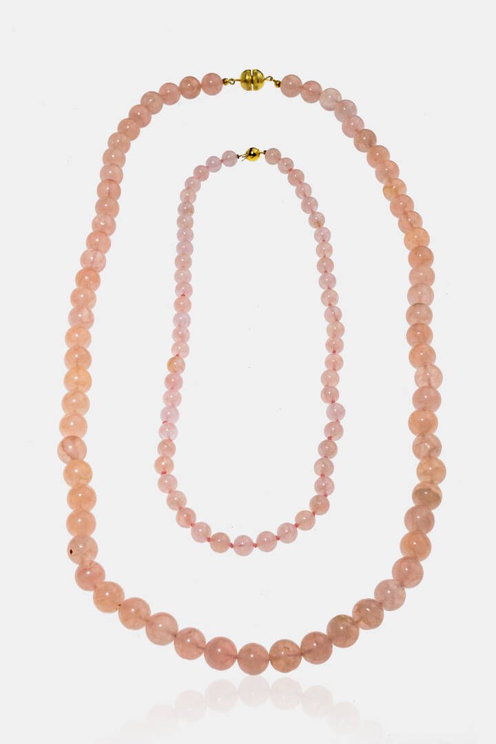 Lunghezza cm 51 e 79 composte da un filo di sfere di quarzo rosa del diam 12 e del diam di mm 8 5. La collana più lunga presenta chiusura in metallo dorato la più corta in oro giallo a sfera.