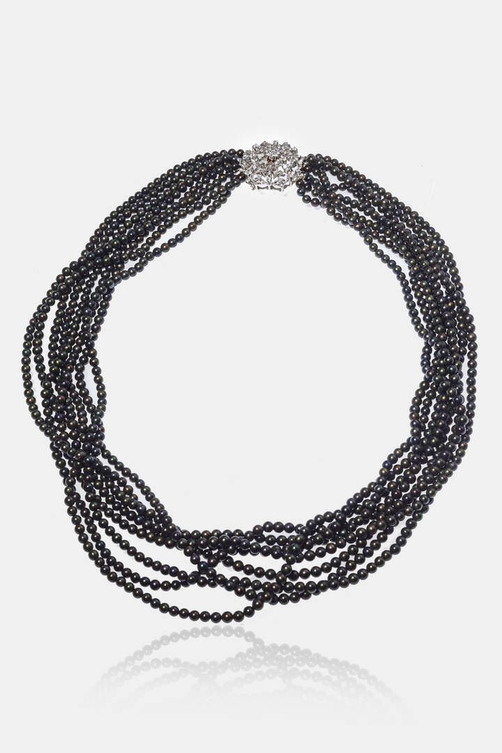 Lunghezza cm 54 composta da otto fili perle di acqua dolce nei toni del nero-verde del diam. di mm 4. Chiusura oro bianco con diamanti taglio 8/8 per totali ct 0 40 ca