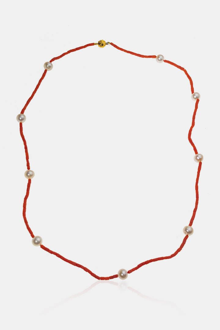 Lunghezza cm 83 composta da barilotti di corallo rosso mediterraneo alternati a perle di acqua dolce del diam. di mm 11 5. Chiusura in oro giallo a quadrifoglio Certificato del perito Caviglia di Roma