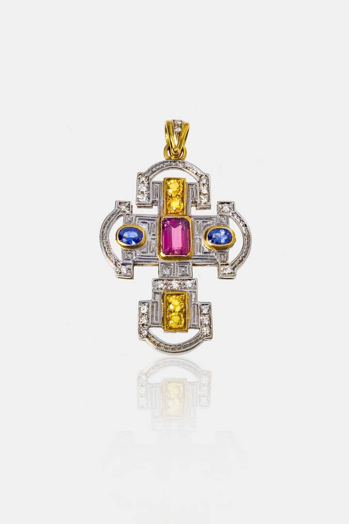 Peso gr 13 5 Cm 5x3 in oro giallo e bianco a forma di croce con al centro tormalina rosa taglio ottagonale di ct 2 0 ca zaffiri di colore blu e giallo taglio ovale e rotondo per totali ct 1 50 ca e diamanti taglio brillante per totali ct 0 30 ca