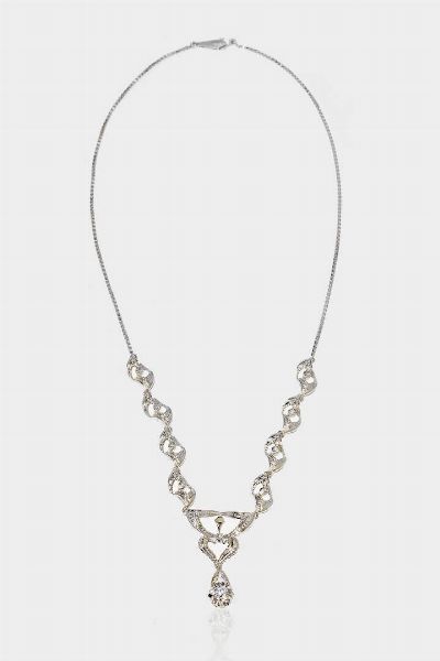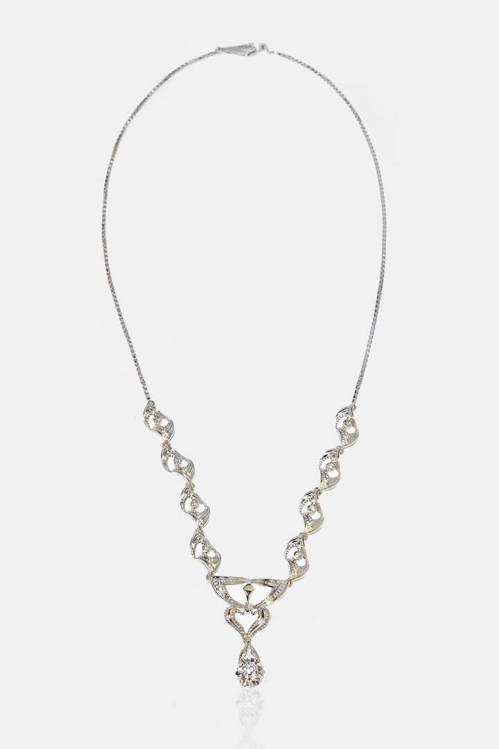 Peso gr 13 6 Lunghezza cm 43 in oro bianco anni '50 con al centro volute con diamanti taglio brillante per totali ct 0 40 ca.