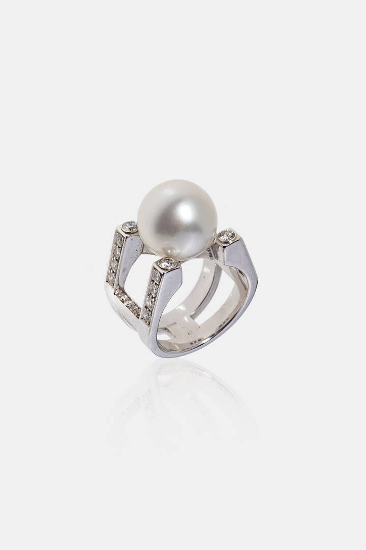 Peso gr 17 1 Misura 13 (53) in oro bianco firmato Bigi con perla australiana del diam di mm 13; diamanti taglio brillante per totali ct 0 90 ca