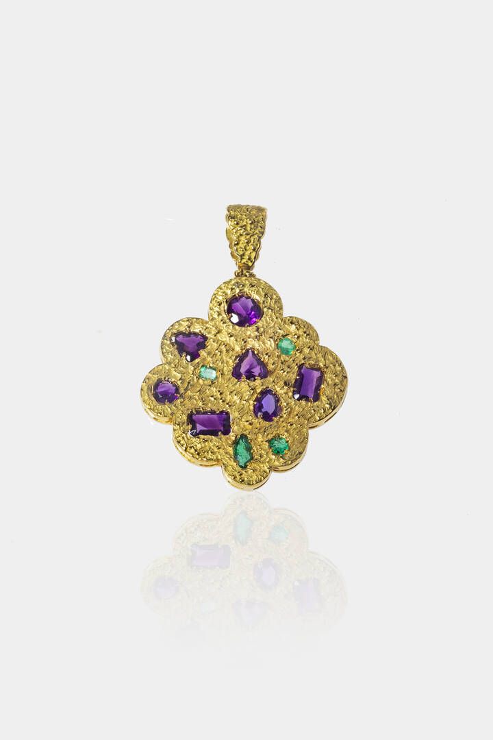 CIONDOLO : Peso gr 18 2 Cm 5 5x3 5 in oro giallo lavorato a corteccia  di forma polilobata  con ametiste e smeraldini per totali ct 0 80 ca taglio a goccia  triangolare  ovale e rettangolare.  - Asta Gioielli  - Associazione Nazionale - Case d'Asta italiane