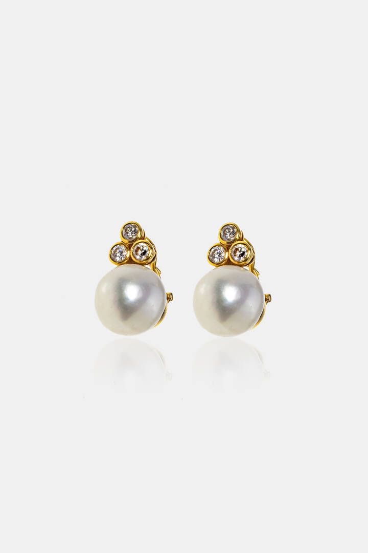 Peso gr 19 1 in oro giallo con due perle australiane del diam. di mm 15 sormontate da sei diamanti taglio brillante per totali ct 0 90 ca probabile colore G-H.