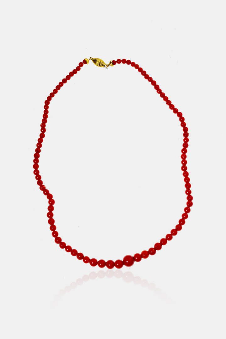 Peso gr 24 9 Lunghezza cm 50 5 composto da un filo di sfere di corallo rosso mediterraneo a scalare. dal diam. di mm a mm 10 a 5 mm. Chiusura a barilotto fesonato in oro giallo
