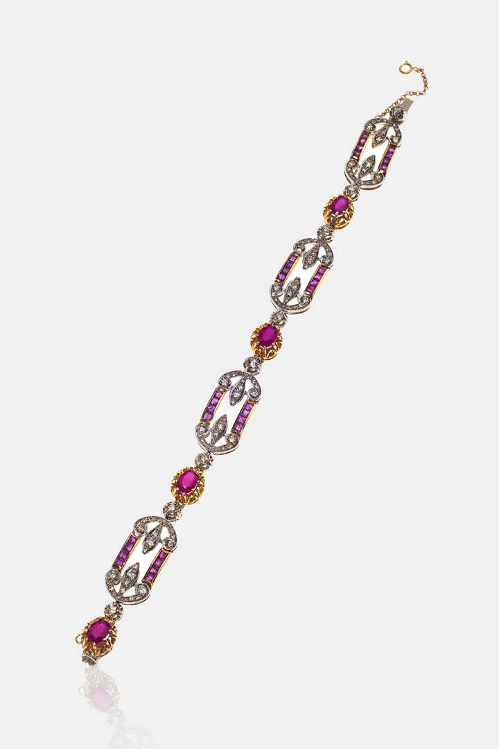 Peso gr 25 4 Lunghezza cm 19 in oro rosa e bianco 14 Kt composto da segmenti rigidi ovali in diamanti taglio brillante di colore brown per totali ct 2 0 ca rubini taglio carré e rotondo per totali ct 7 ca