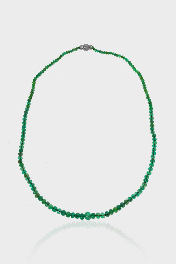 Peso gr 27 2 Lunghezza cm 57 composto da un filo di sfere a scalare di smeraldi dal diam. di mm 3 8 a 9 ca per totali ct 120 ca. Chiusura a sfera in oro bianco con diamanti taglio brillante per totali ct 0 50 ca.
